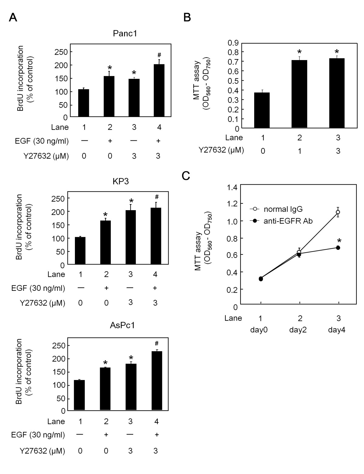 (A) Panc1, KP3 and AsPc1 cells were pretreated with 3 μM Y27632 or vehicle in RPMI containing 0.3% FCS for 1 h, and then stimulated with 30 ng/ml of EGF or vehicle for 24 h. The BrdU incorporation as the % of the control (lane 1) is shown. (B) Panc1 cells were treated with the indicated doses of Y27632 or vehicle in RPMI containing 3% FCS for 48 h, and the cell viability assay was performed using the MTT cell proliferation kit I. (C) The attached cells were treated with 0.5 μg/ml of normal mouse-IgG (open circle) or anti-EGFR-neutralizing antibodies (closed circle) for the indicated periods in medium containing 3% FCS, and the surviving cells were counted using the MTT cell proliferation kit I. The results are expressed as the absorbance (OD 560 nm-OD 750 nm). All assays were done in triplicate. (*) indicates a significant difference (p < 0.05) compared with lane 1, (#) indicates a significant difference (p < 0.05), compared with lane 2.