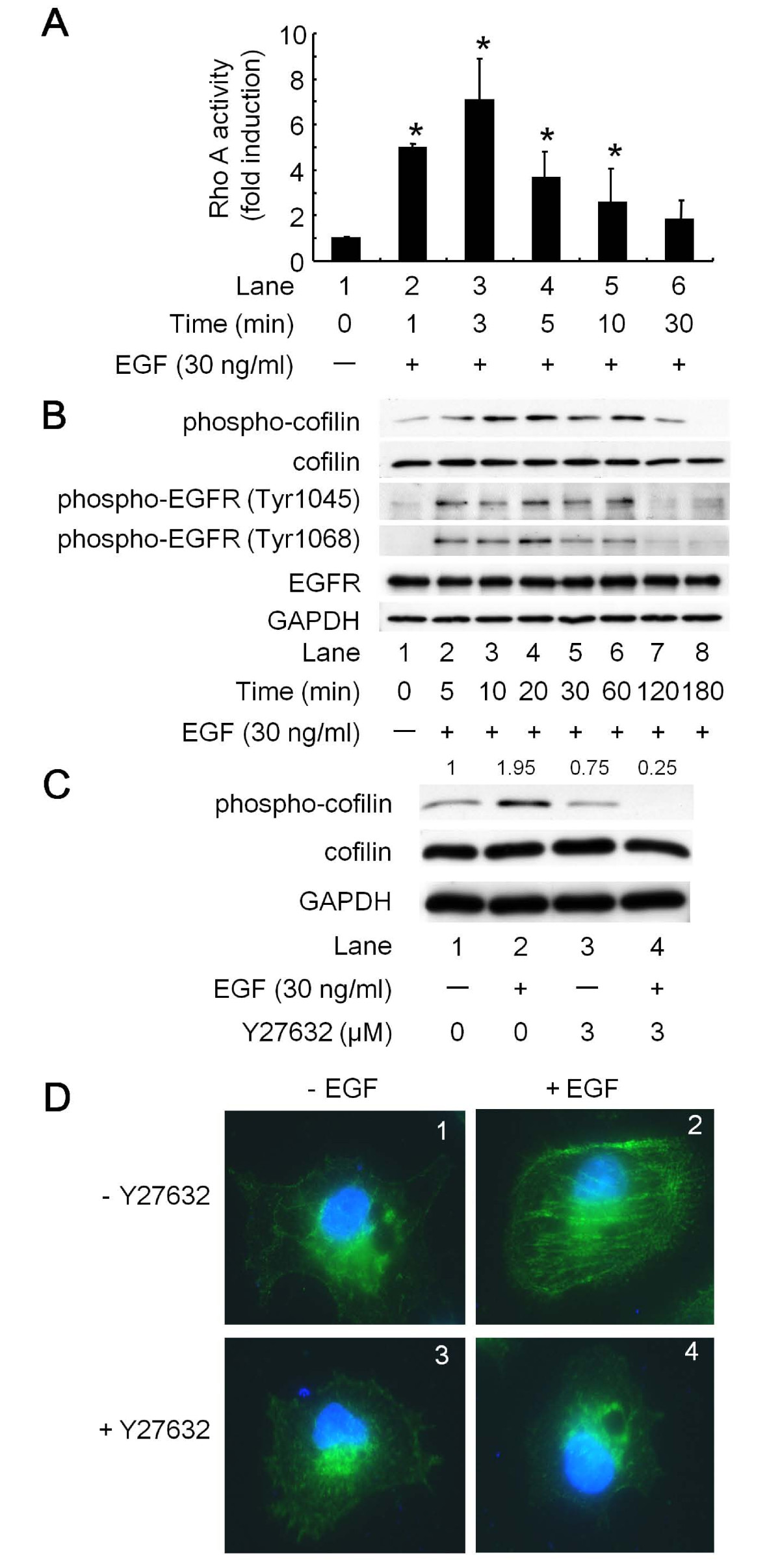 (A) Panc1 cells were stimulated with 30 ng/ml of EGF for the indicated periods, and RhoA activity was measured by G-LISAℜ Small G-protein Activation Assays. The results are expressed as the fold increase compared with untreated control cells. Bars designate SD of triplicate assays. (*) indicate significant increases (p < 0.05) compared to control cells. (B) Panc1 cells were stimulated with 30 ng/ml of EGF for the indicated periods. (C) Panc1 cells were pretreated with 3 μM Y27632 or vehicle for 1 h, and stimulated with 30 ng/ml of EGF or vehicle for 10 min. The cell lysates were then harvested and Western blotting were performed with antibodies against phospho-cofilin, cofilin, phospho-EGFR (Tyr1045 and Tyr1068), EGFR and GAPDH. The intensities of protein bands were determined by integrating the optical density over the band area using the NIH image software program. The intensity of each protein band was divided by the control (lane 1), and is shown above each panel. (D) Panc1 cells were treated with 3 μM Y27632 or vehicle for 1 h, followed by exposure to 30 ng/ml of EGF or vehicle for 10 min. After fixation, they were exposed to anti-phospho MLC antibodies, Alexa Fluor 488®-conjugated goat anti-rabbit IgG antibodies and DAPI. The cells were examined by fluorescence microscopy.