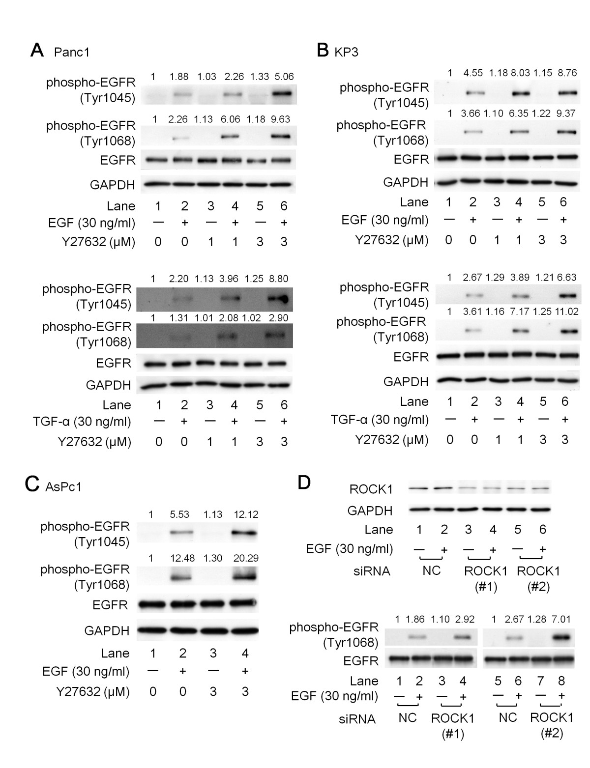 (A-C) Panc1 (A), KP3 (B) and AsPc1 (C) cells were pretreated with the indicated concentrations of Y27632 or vehicle for 1 h, and then stimulated with 30 ng/ml of EGF or 30 ng/ml of TGF-α or vehicle for 5 min. The cell lysates were then harvested and Western blotting were performed with antibodies against phospho-EGFR (Tyr1045 and Tyr1068), EGFR and GAPDH. (D) Upper panels; Panc1 cells were transfected with 10 nM of a negative control siRNA or siRNAs specifically targeting ROCK1 (#1 and #2) for 48 h, and then stimulated with 30 ng/ml of EGF or vehicle for 5 min. The cell lysates were then harvested and Western blotting was performed with antibodies against ROCK1, phospho- EGFR (Tyr1068), EGFR and GAPDH. The intensities of protein bands in the Western blot analysis were determined by integrating the optical density over the band area using the NIH image software program. The intensity of each protein band was divided by the control (lane 1), and is shown above each panel.
