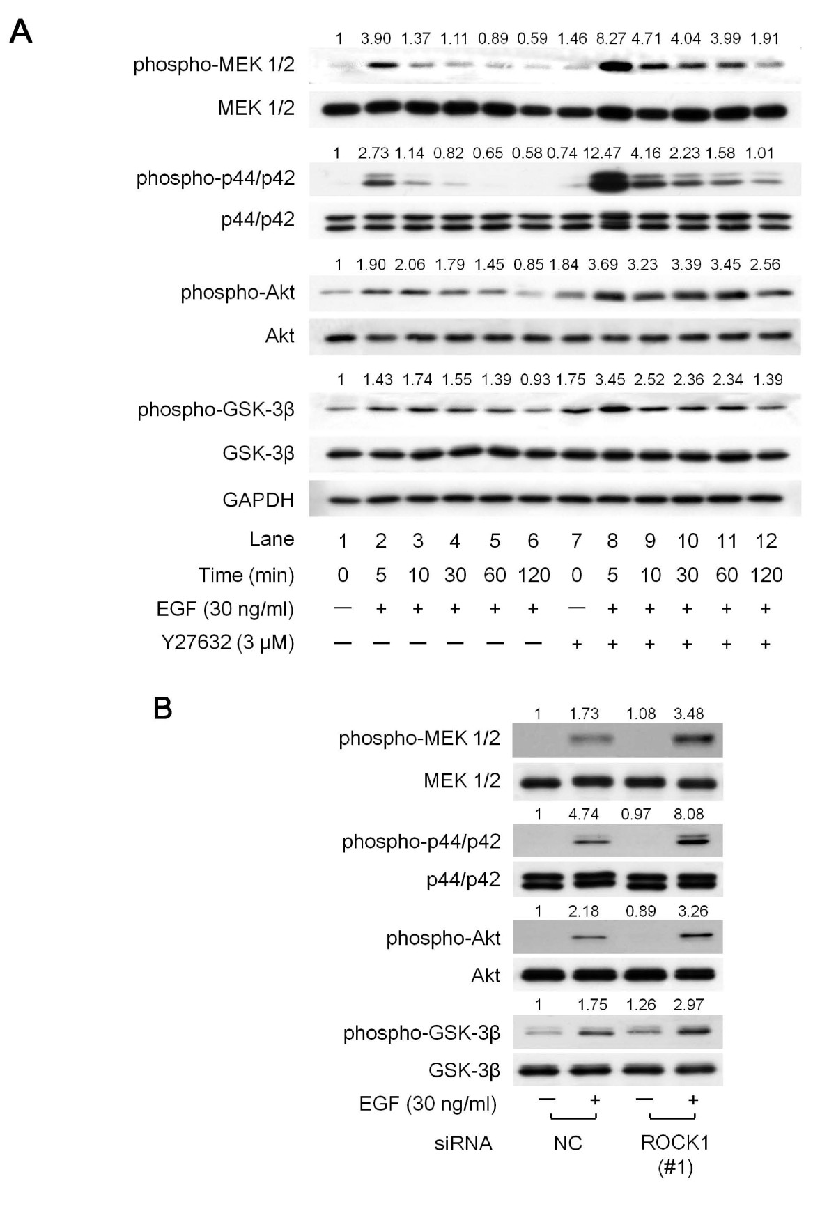 (A) The cells were pretreated with 3 μM Y27632 or vehicle for 1 h, and then stimulated with 30 ng/ml of EGF or vehicle for the indicated periods. (B) The cells were transfected with 10 nM of a negative control siRNA or siRNAs specifically targeting ROCK1 (#1) for 48 h, and then stimulated with 30 ng/ml of EGF or vehicle for 5 min. The cell lysates were then harvested and Western blotting were performed with antibodies against phospho-MEK1/2, MEK1/2, phospho-p44/p42 MAP kinase, p44/p42 MAP kinase, phospho-Akt, Akt, phospho-GSK-3β, GSK-3β and GAPDH. The intensities of protein bands in the Western blot analysis were determined by integrating the optical density over the band area using the NIH image software program. The intensity of each protein band was divided by the control (lane 1), and is shown above each panel.