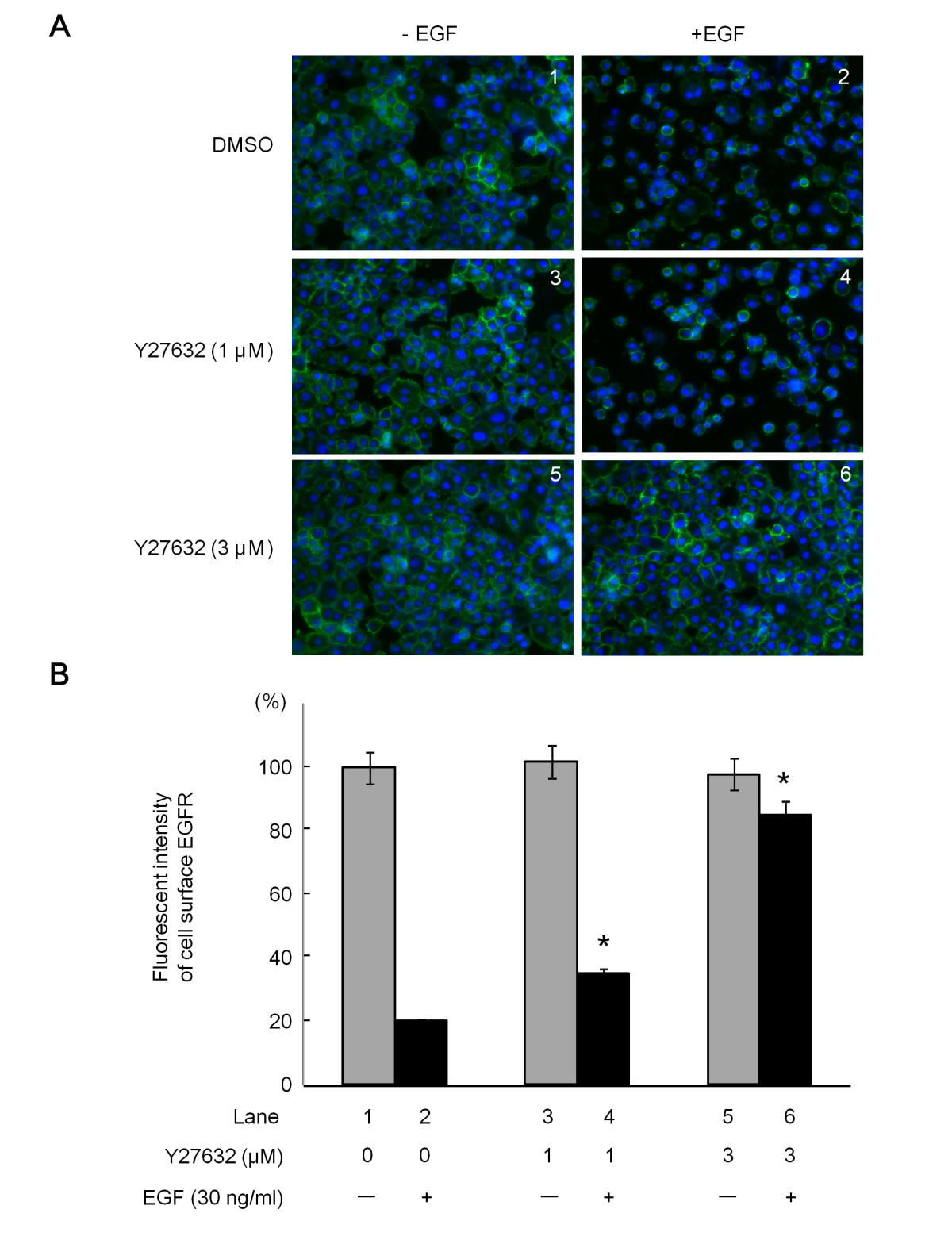 (A) Panc1 cells were treated with the indicated concentrations of Y27632 or vehicle for 1 h at 37°C, and then labeled for 15 min at 37°C with anti-EGFR antibodies which recognize the extracellular domain of the EGFR. The cells were then exposed to 30 ng/ml of EGF for 10 min at 37°C. To observe only the cell surface EGFR that remained on the plasma membrane, these cells were not permeabilized with Triton X-100. They were then exposed to Alexa Fluor 488®-conjugated donkey anti-goat IgG antibodies and DAPI for 1 h. Representative cells examined by fluorescence microscopy are shown. (B) Green fluorescence signals from the remaining cell surface EGFR were measured using the NIH image software program, and expressed as the % of the control (compared with untreated control cells).