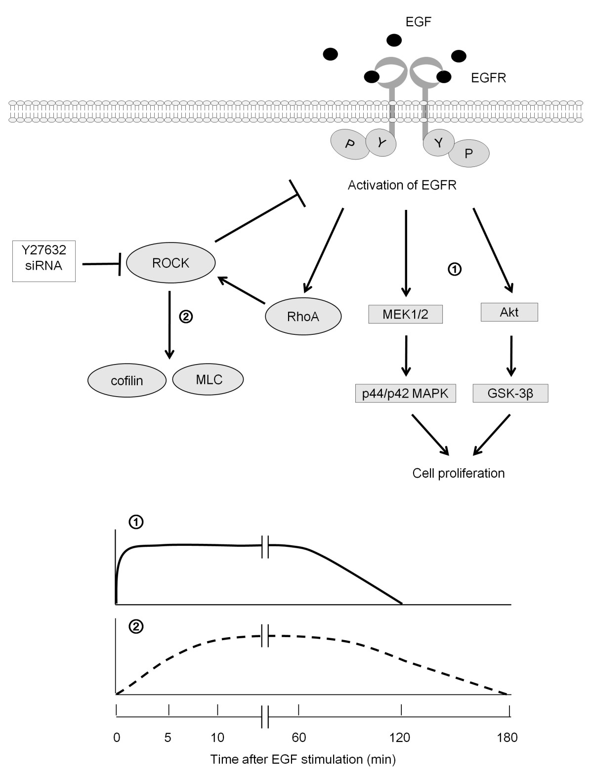 Our hypothetical pathway underlying ROCK-mediated signaling is summarized in Figure 6. After EGF binds to EGFR molecules on the cell surface, the receptor undergoes dimerization and autophosphorylation at tyrosine residues. This triggers EGFR-related downstream signaling, such as through the MEK1/2-p44/p42 MAP kinase or Akt pathways, within 5 min of stimulation (Figure 4). Around 5 min after stimulation is initiated, EGF starts to induce RhoA-mediated activation of ROCK, as demonstrated by up-regulation of cofilin and MLC phosphorylation (Figure 2). Inhibition experiments with Y27632 or siRNA indicated that ROCK suppresses the activation of the EGFR and the downstream pathways of MEK1/2 and Akt beginning at 5 min after the start of stimulation (Figures 3 and 4).