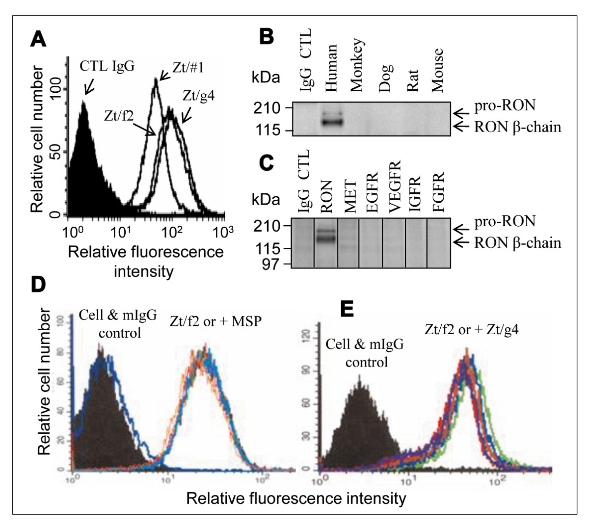 Anti-RON mAbs were obtained by classical hybridoma methods (4)(29) and characterized (Table 1). Zt/f2 was selected for further evaluation. Immunofluorescent analysis indicated that Zt/f2 binds to an epitope(s) on RON extracellular sequences (Figure 1A) and displays similar binding affinity as Zt/g4 at a defined concentration. Zt/f2 recognized the native RON receptor but not denatured protein under reduced conditions (data not shown). Species cross-reactivity studies showed that Zt/f2 is highly specific to human RON and does not recognize RON homologues expressed by monkey, dog, rat, and mouse (Figure 1B). Immunoprecipitation analysis of the cross-reactivity with different RTK proteins showed that Zt/f2 at 10 μg per ml fails to recognize MET, EGFR, IGFR, FGFR, and VEGFR (Figure 1C). To determine if Zt/f2 competes with MSP or Zt/g4 for binding to RON, we performed binding competition experiments. Results in Figure 1D showed that the binding of 3 nM FITC-labeled Zt/f2 to 3T3-RON cells was not inhibited by increased amounts of MSP. The fluorescence intensity from individual samples containing MSP ranging from 1 to 40 nM was all overlaid with the sample containing Zt/f2 alone. Similarly, the Zt/f2 binding to RON was not replaced by the increased amounts of Zt/g4 (Figure 1E), which recognizes RON sema domain (29). Taken together, results in Figure 1 demonstrate that mAb Zt/f2 is highly specific and sensitive to human RON. It binds to an epitope(s) on the RON extracellular sequences, which differs from MSP and Zt/g4.
