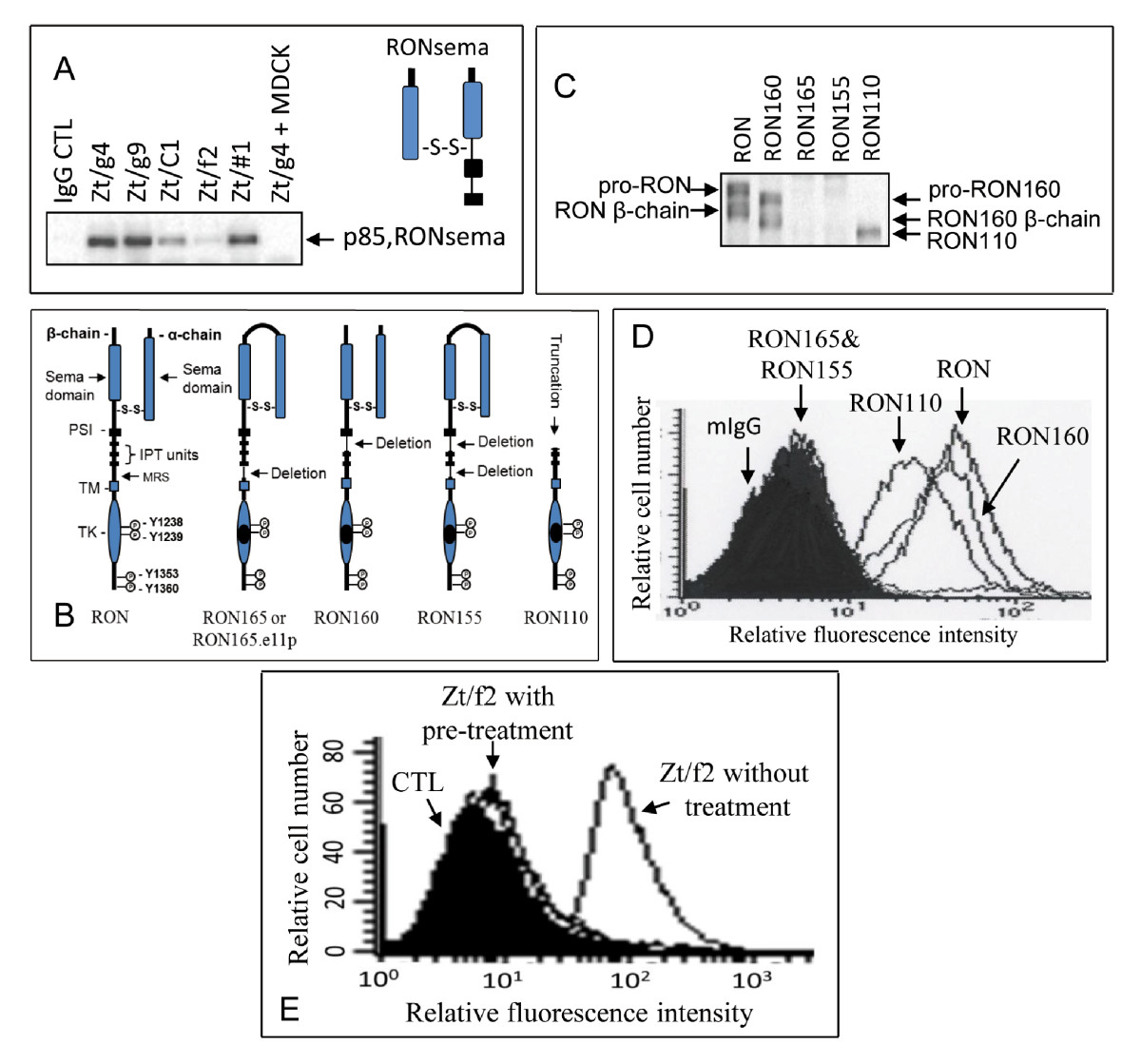 To determine the potential binding region of Zt/f2, we first tested if Zt/f2 binds to a naturally occurring RON variant (known as RONsema) comprising the entire sema domain, PSI hinge, and a N-terminal portion of the first IPT unit (20). Results from co-immunoprecipitation showed that control mAb Zt/g4 and Zt/#1 strongly interacted with the RONsema (Figure 2A), indicating that these mAbs bind to an epitope(s) located on the RONsema proteins. However, incubation of Zt/f2 with RONsema did not result in any detectable RONsema in Western blot analysis after co-immunoprecipitation (Figure 2A), suggesting that the binding region of Zt/f2 is not located on the RONsema protein.