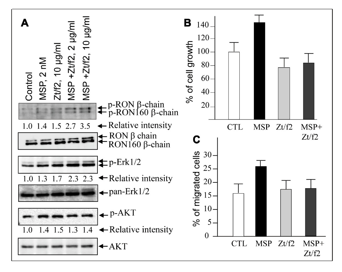 Deletion of MRS results in constitutive phosphorylation of RON (23)(24). To determine if Zt/f2 binding to this region affects RON activation, cells were serum-starved overnight and treated with MSP or Zt/f2 for 15 min. A trace of RON and RON160 phosphorylation was detected in HT-29 cells (Figure 3A). MSP stimulation slightly increased the levels of phosphorylation. Zt/f2 treatment alone results in a slight increase in RON phosphorylation. A moderate level of synergism in RON phosphorylation was observed when Zt/f2 was combined with MSP. Also, Zt/f2 alone moderately increased Erk1/2 and AKT phosphorylation. We observed a moderate increase in Erk1/2 or AKT phosphorylation when MSP and Zt/f2 were combined. To study if phosphorylation translates into cell proliferation, the effect of Zt/f2 on HT-29 cell growth was determined. Treatment of cells with Zt/f2 for three days moderately inhibited cell growth compared to control or MSP-stimulated cells (Figure 3B). Similarly, Zt/f2 moderately inhibited MSP-induced cell proliferation. Analysis of cell transmembrane migration revealed that Zt/f2 only has marginal effect on HT-29 cell migration (Figure 3C). A moderate inhibition by Zt/f2 in MSP-induced cell migration also was observed. Taken together, results in Figure 3 suggest that although Zt/f2 slightly increases RON, Erk1/2, and AKT phosphorylation, it moderately inhibits MSP-stimulated or non-stimulated HT-29 cell growth but only slightly prevents these cell migrations.