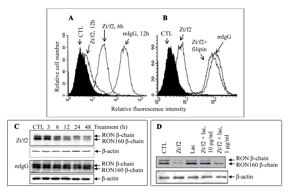 A) Down-regulation of RON/RON160 expression by Zt/f2. HT-29 cells (1 × 106 cells/sample) were treated with Zt/f2 (10 μg/ml) or control mouse IgG at 37°C for 6 and 12 h. After treatment, cells were washed with acidic buffer to eliminate surface-bound antibody (Guin et al., 2010) and then incubated with Zt/g4 (1 μg/sample) to detect RON/RON160 remaining on the cell surface by flow cytometric analysis. B) Preventive effect of filipin on Zt/f2-induced RON reduction. HT-29 cells were pre-incubated with filipin (10 μg/ml) for 30 min and then treated at 37°C for 12 h with Zt/f2 or control mouse IgG (10 μg/ml). After washing with acidic buffer, RON on cell surface was detected by Zt/g4 as previously described (Guin et al., 2010). C) Kinetic effect of Zt/f2 on RON/RON160 expression. HT-29 cells were treated with 10 μg/ml of Zt/f2 for various times. RON expression was determined by Western blot analysis. Normal mouse IgG was used as the control. D) Preventive effect of lactacystin on Zt/f2-induced RON reduction. HT-29 cells were pre-incubated with 1 or 10 μg/ml of lactacystin for 30 min and then treated with 10 μg/ml of Zt/f2 at 37°C for 12 h. Levels of RON were determined by Western blot analysis.