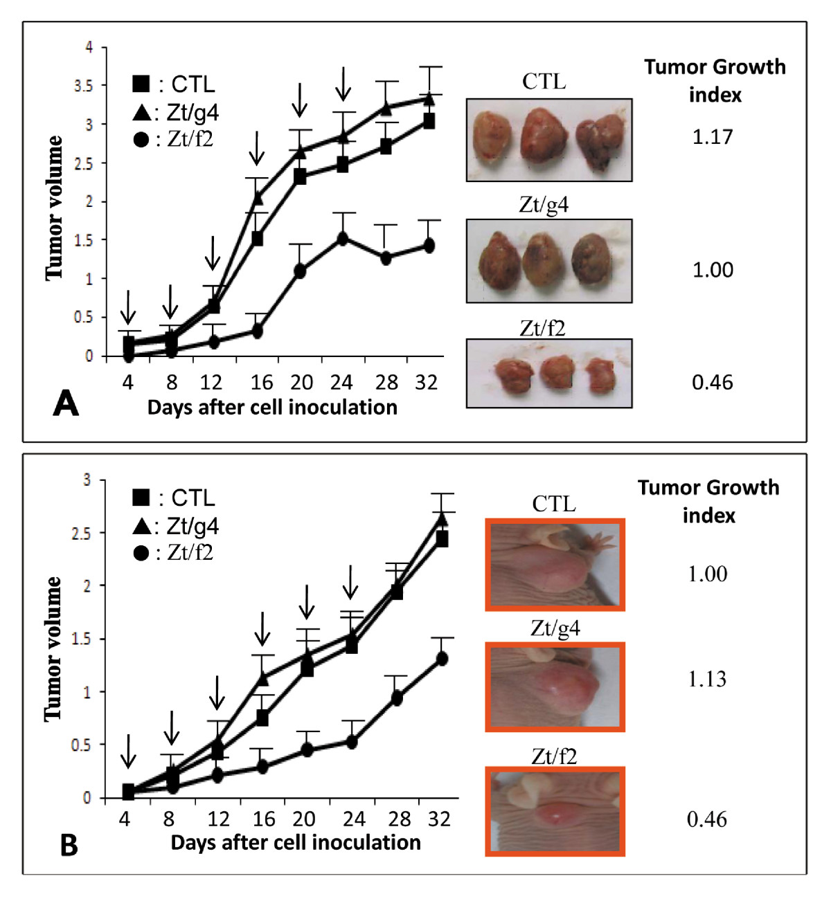 Induction of tumors in Balb/c mice by NIH3T3-RON160 cells (A) or in athymic nude mice by HT-29 cells (B) was detailed in Materials and methods. Tumor bearing mice were randomized into different groups (3 mice per group). Treatment of animals with Zt/f2, Zt/g4, or control mouse IgG at the defined dose and schedule as detailed in Materials and Methods. Mice were euthanized at day 32 in both experiments. The therapeutic effect of Zt/f2 on tumor growth was obtained by comparing tumor volumes among groups. Antibody injection is marked with arrows. Tumor growth index from control mice was set at 1.00 and used to compare the differences among groups.