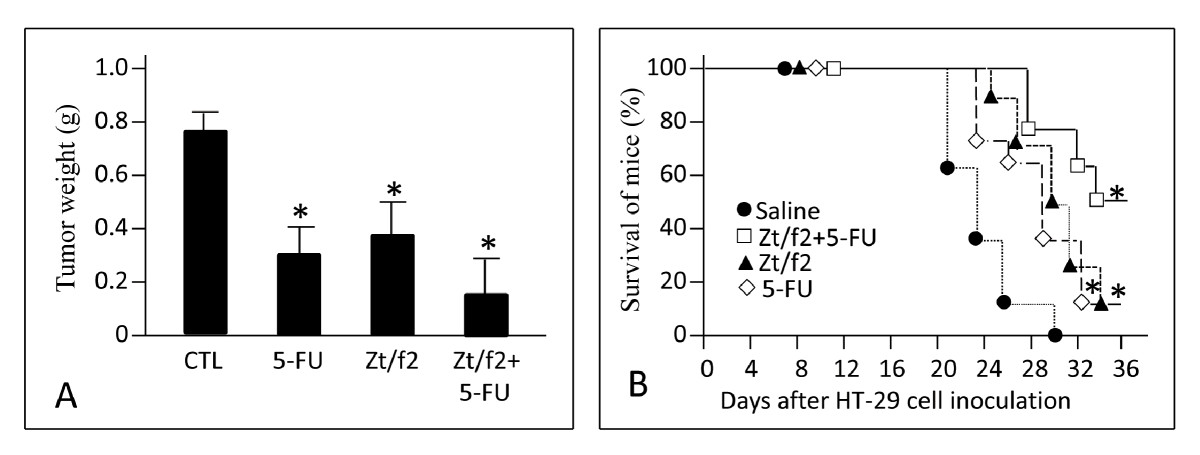 HT-29 cell-mediated tumor growth in athymic nude mice was used as the model (O'Toole et al., 2006). Zt/f2 treatment began when tumor volumes reached about 9 mm3 (around 8 days after cell inoculation). A) Comparison of tumor weights from different groups of G-I. B) Survival rates in different groups of G-II. In both G-I and G-II, statistical significance (p < 0.05) is indicated with a star.