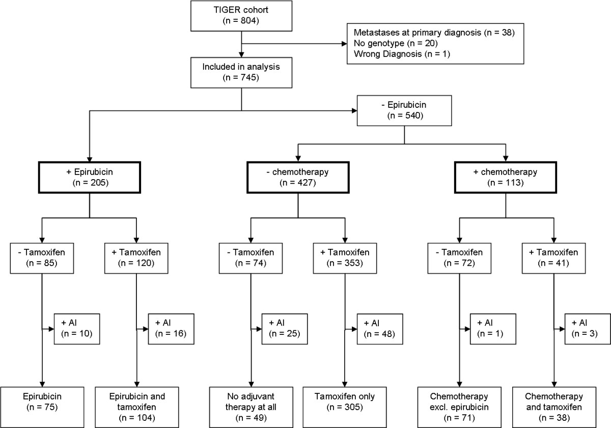 Of the original 804 patients of the TIGER cohort, 59 patients were excluded from this analysis due to metastases already at baseline, the lack of material for PGt analyses, or the revision of the breast cancer diagnosis during follow-up (Figure 1). Of the remaining 745 patients, 205 received epirubicin-based combination chemotherapy, 113 combination chemotherapy without epirubicin (mostly cyclophosphamide, methotrexate and fluorouracil), and 427 no adjuvant chemotherapy at all. Of the 205 epirubicin-treated patients, 120 subsequently also received tamoxifen (Figure 1).