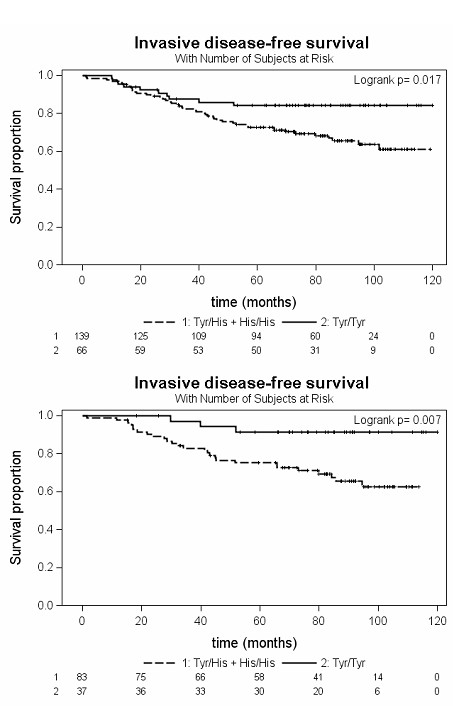 The formation of epirubicin glucuronide represent the main inactivating pathway for epirubicin and studies in human liver microsomes expressing a multitude of UGT isoenzymes, revealed that UGT2B7 uniquely converts epirubicin to its glucuronide (6). To the best of our knowledge, this is the first study providing evidence that genetic UGT2B7 variation contributes to these clinical observations. In our analysis, epirubicin-treated women with the UGT2B7268Tyr/Tyr genotype showed a significantly better invasive disease-free survival as compared to carriers of at least one UGT2B7268His allele. As the use of epirubicin is quite common and the difference in the average invasive disease-free survival times between both variant carriers amounted to about one year, we think this finding might be of broad interest and high relevance in cancer therapy, although it still needs to be confirmed.