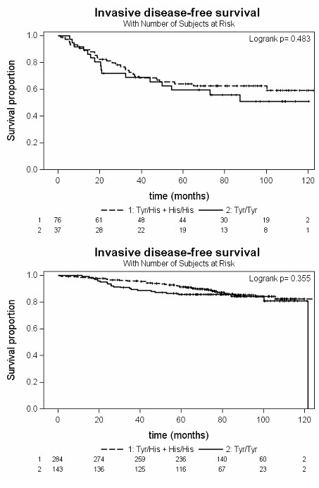 In the patient subgroup not receiving epirubicin, but tamoxifen in monotherapy (n = 305), there was no association of invasive disease-free survival with the UGT2B7His268Tyr genotype (log-rank P = 0.20), as well as in any other patient group not receiving epirubicin (Figure 3, Table 3).