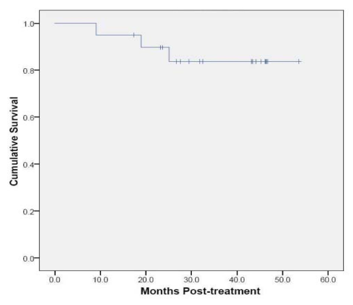 No regional lymph node failures have been observed. Three patients are alive with distant lung metastases. Deaths have been attributed to progressive lung dysfunction at 9, 18 and 25 months, respectively. Therefore, with a median follow-up of 43 months, the 2-year Kaplan-Meier estimated overall survival is 90% (Figure 1).
