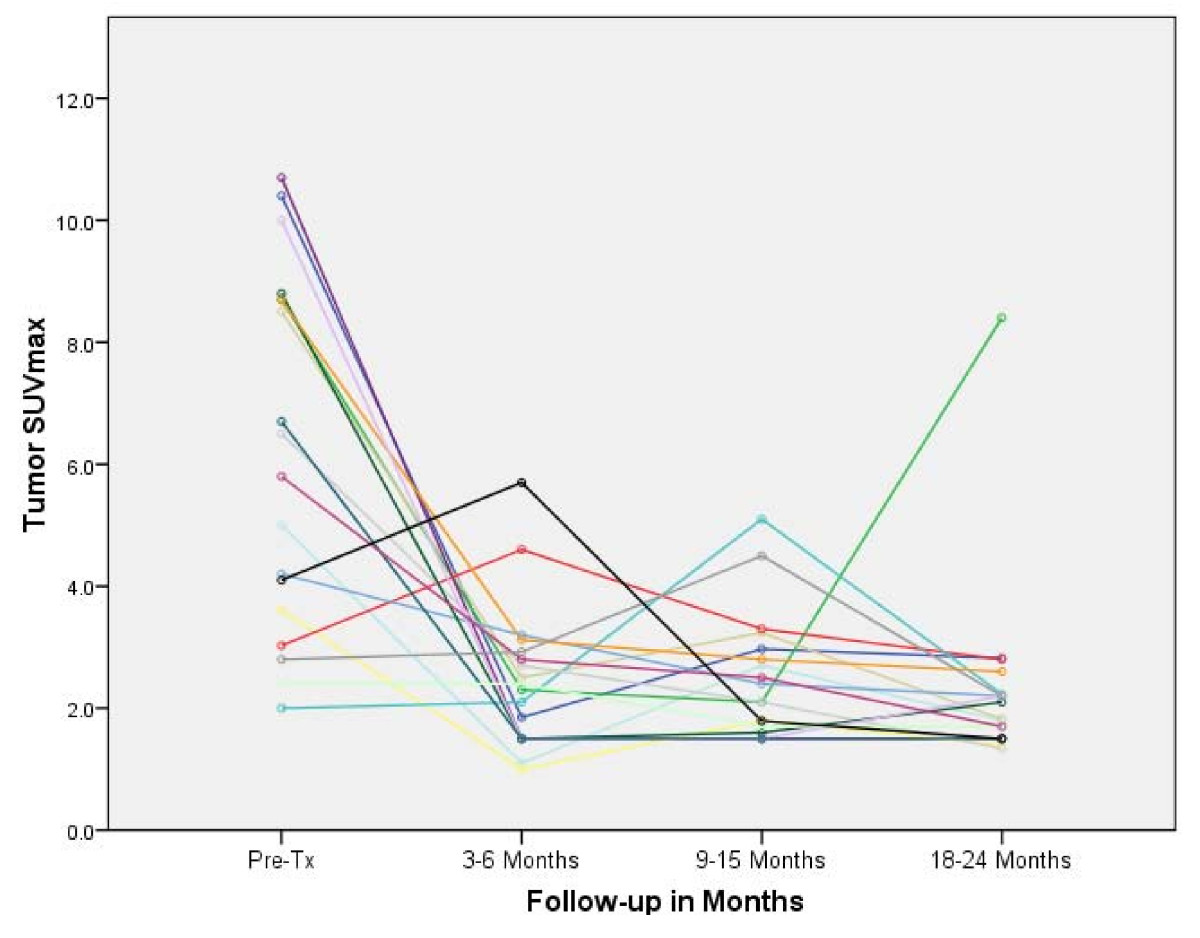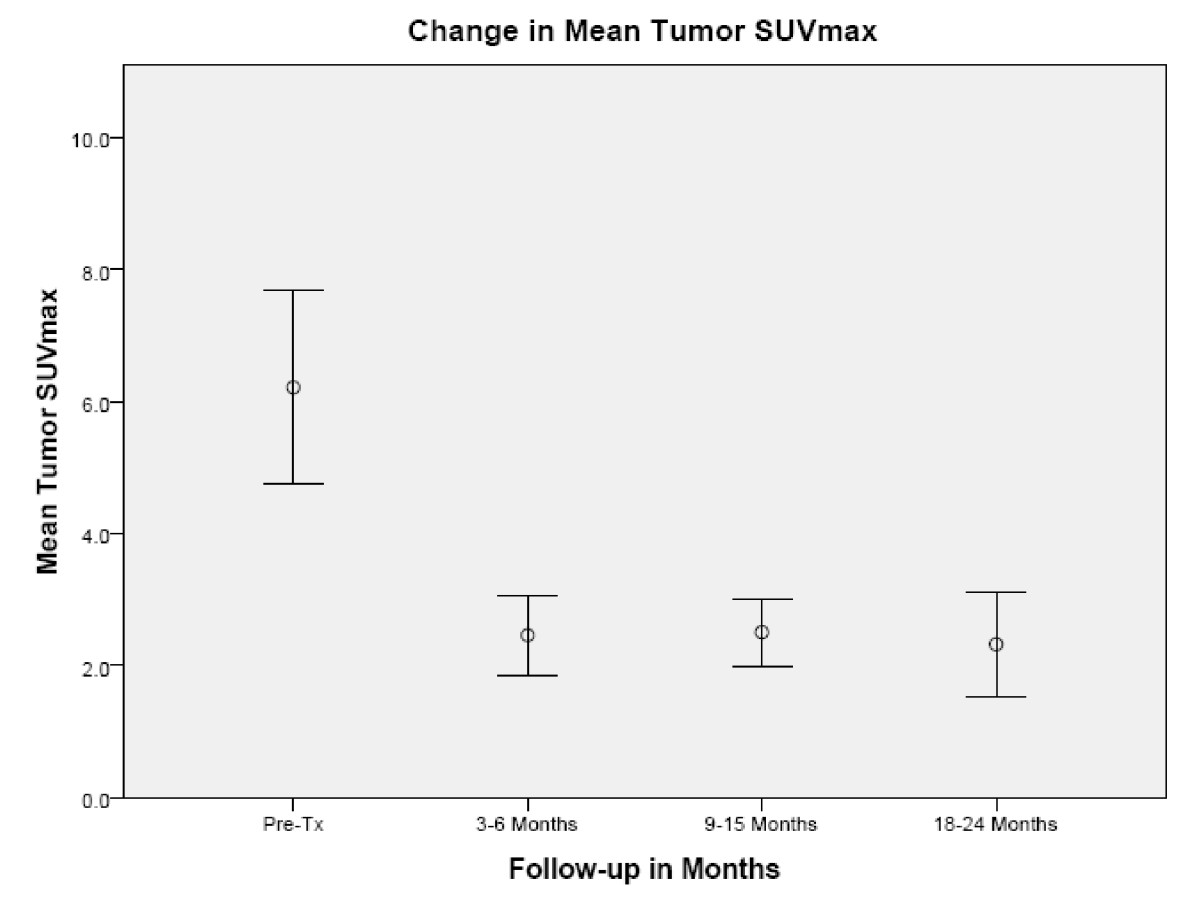 a narrow range of values (range, 1.5 to 2.8). A single local failure was confirmed at 24 months in a patient with an elevated tumor SUVmax of 8.4.
