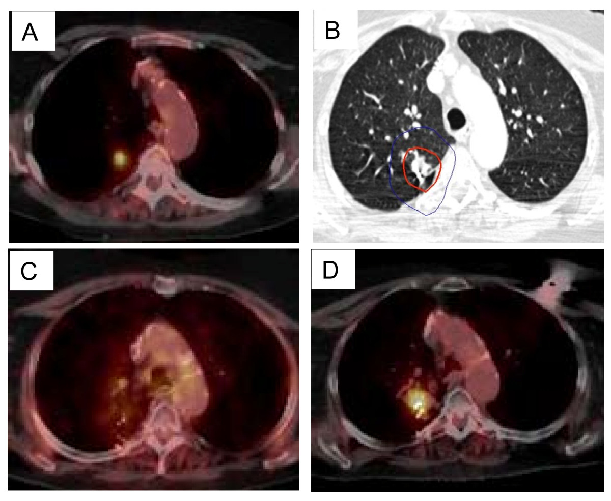 Prior to initiating the CyberKnife radiosurgery protocol for inoperable stage IA NSCLC patients, published reports had documented deficiencies with CT tumor response assessment following SBRT (13)(14). SBRT delivered to small peripheral lung tumors with adequate margin damages peritumoral lung tissue and often causes acute radiation pneumonitis (23). Repair of the lung injury typically results in asymptomatic focal lung parenchyma fibrosis in the region that corresponds with the high-dose radiation volume (13)(14). As expected, CT imaging evidence of focal radiation-induced pneomonitis and fibrosis was consistently observed within the target volumes of our patients during follow-up as well (18)(19). 18F-FDG PET/CT is the standard imaging tool for NSCLC at Georgetown University Hospital. It is both more sensitive and specific than conventional imaging for the detection of primary lung tumors, involved regional lymph nodes and distant metastases (24)(25). Primary lung tumors with a SUVmax greater than 2.5 are considered malignant until proven otherwise. However, preliminary evidence suggested that like CT imaging, 18F-FDG PET imaging is limited in assessing local tumor control following SBRT due to early elevations in tumor SUVmax, which are thought to be related to acute radiation-induced pneomonitis (15). Therefore, prior to starting protocol therapy, the decision was made to routinely observe inoperable patients with early transient elevations in tumor SUVmax following radiosurgery.