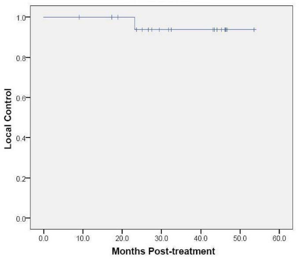 Data was analyzed and graphs were prepared with the SPSS 16.02 statistical package. The follow-up duration was defined as the time from the date of completion of treatment to the last date of follow-up or the date of death. Actuarial survival and local control were calculated from the conclusion of treatment using the Kaplan-Meier method.