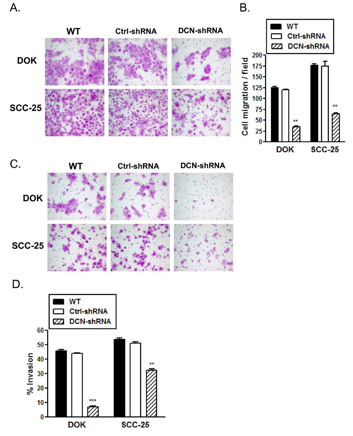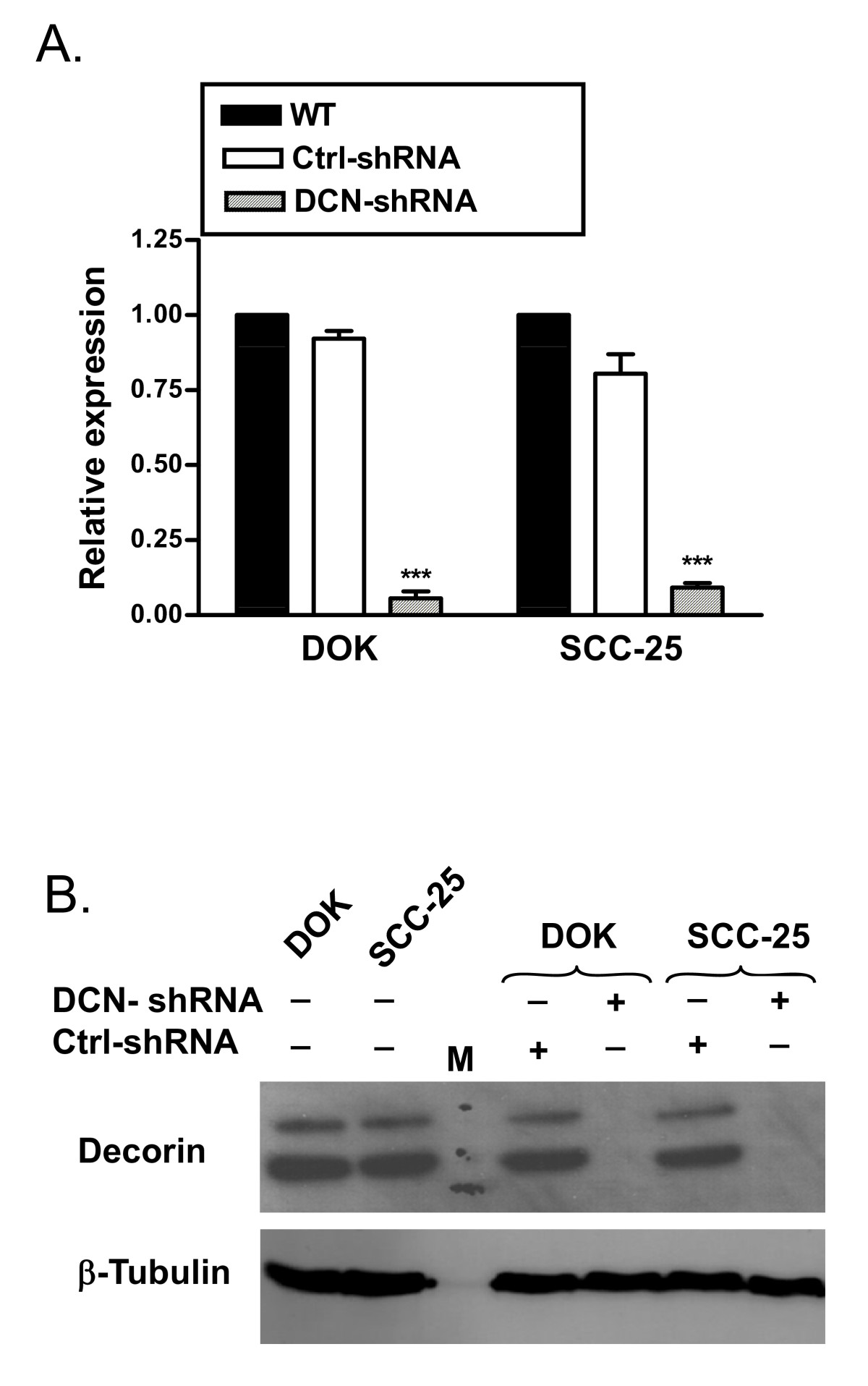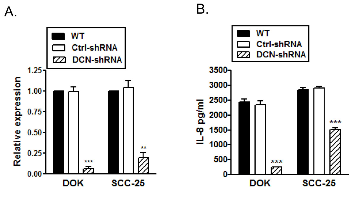 DOK and SCC-25 cells were stably transfected with decorin-shRNA (DCN-shRNA), or scrambled sequence-shRNA (Ctrl-shRNA) or no transfection control (WT). A, RNA was extracted and cDNA was subjected to quantitative RT-PCR, normalized decorin expression from one representative experiment of three. B, Nuclear lysates were extracted and were subjected to SDS-PAGE followed by immunoblotting with anti-decorin and anti-β-tubulin antibodies. Data presented is one representative immuoblot of at least three experiments. *** p < 0.001 compared to respective controls.