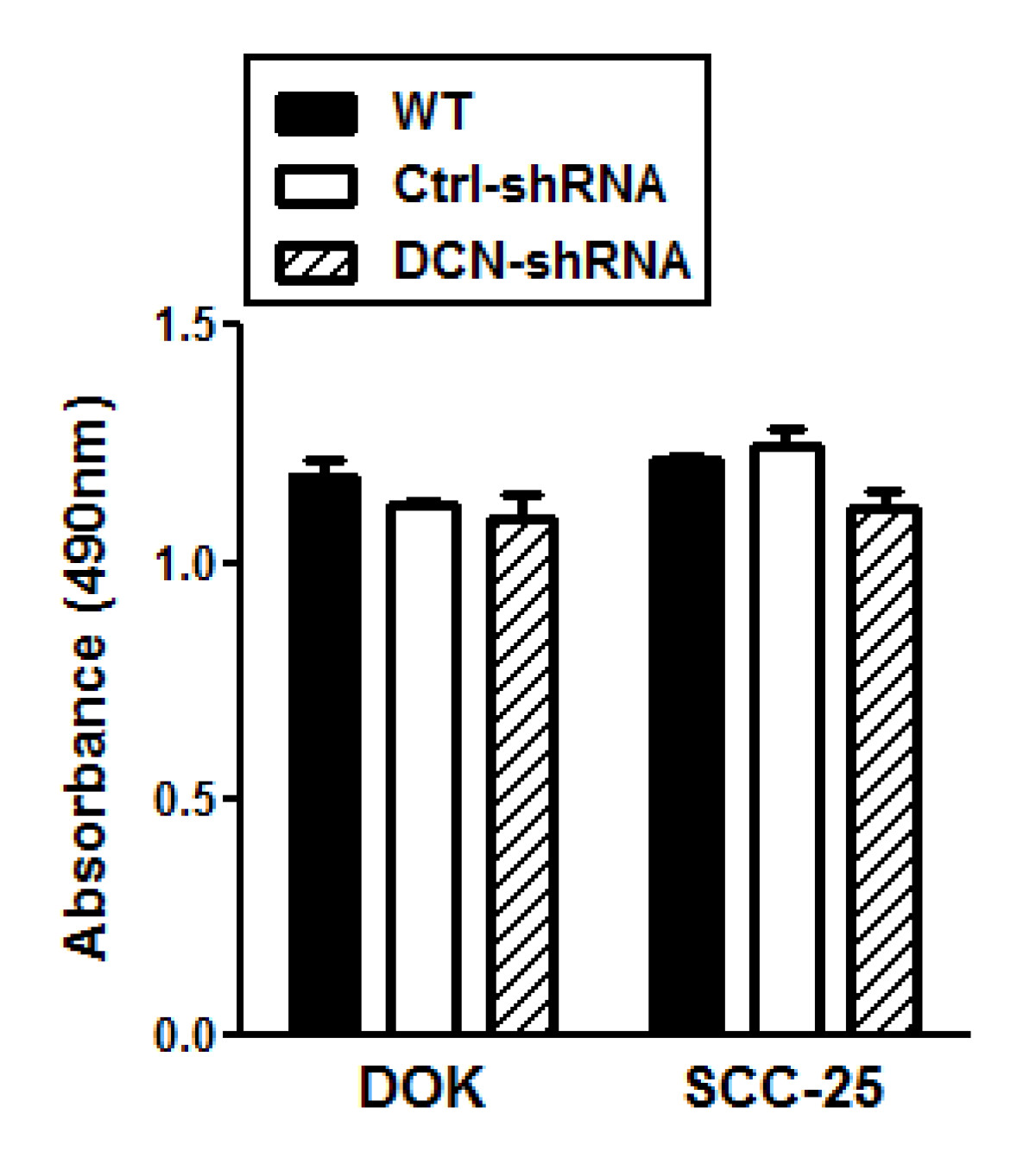 To evaluate the effect of aberrantly expressed nuclear decorin on the cellular proliferation rates of dysplastic and malignant oral epithelial cells, DOK and SCC-25 WT cells, DCN-shRNA transfectants and ctrl-shRNA transfectants were allowed to grow in culture for 24, 48 and 72 h and proliferation was assessed by MTS assay. Compared with WT or control-shRNA cells, decorin silenced DOK and SCC-25 cells did not show any change in cell proliferation rates at 24 hrs (Figure 2). Similar results were obtained at 48 and 72 h time points (data not shown). This might be due to sequestration of decorin in the nucleus and consequent inability to interact with membrane receptors to which extracellular decorin is known to bind to effect tumor growth in other cancers.