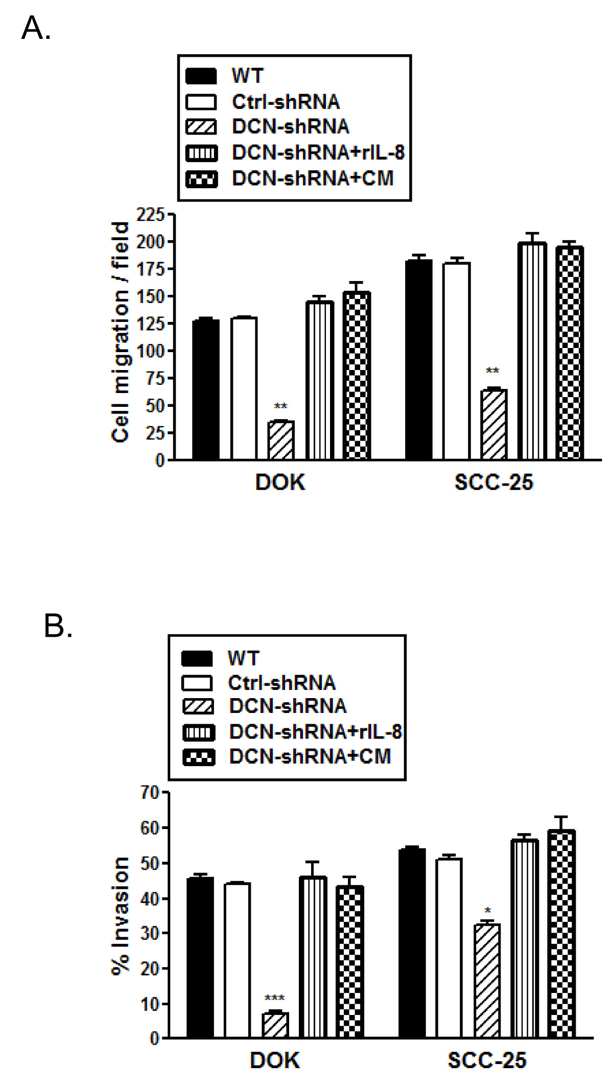 Decorin silenced DOK and SCC-25 cells were cultured with 2.5 ng/ml of recombinant human IL-8 (R&D Systems, Minneapolis, MN) or conditioned medium (CM) from respective wild type cell lines for 24 h prior to migration and invasion assay. A, Cell motility through uncoated filters (migration) was measured 22 h after plating. The migrating cells were fixed, stained, and photographed as described in materials and methods. A, Migrated cells in each one of the five fields of duplicate filters were counted, numbers represent mean ± SD of three experiments. B, Cells that invaded across the Matrigel™ layer were fixed, stained, and photographed. Migrated and invaded cells in five fields of duplicate filters were counted and % invasion was calculated as described in materials and methods. Numbers represent mean ± SD of three individual experiments. * p < 0.05, ** p < 0.01, *** p < 0.001 compared to respective controls.