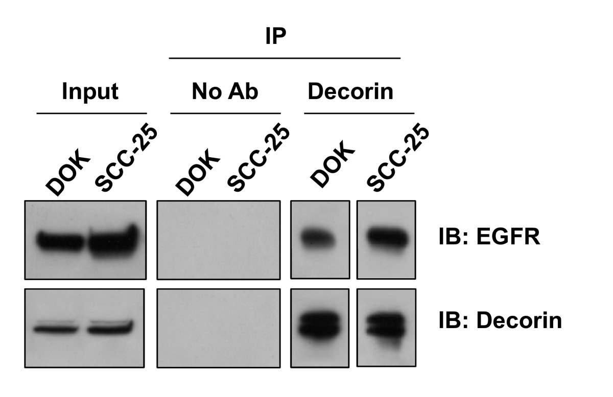 We have previously shown that decorin is aberrantly expressed and localized to the nucleus in DOK and SCC-25. However, decorin is not known to carry nuclear localization signal. In an effort to identify possible binding partners of decorin in the nucleus of these dysplastic and malignant oral epithelial cells, we explored weather nuclear decorin physically associates with nuclear EGFR. Nuclear lysates were obtained from DOK and SCC-25 cells. Interestingly, immunoprecipitation with decorin antibody co-precipitated EGFR in both dysplastic (DOK) and malignant (SCC-25) oral epithelial cells (Figure 6). However, similar immunoprecpitation with decorin antibody did not co-precipitate either biglycan or LRRFIP2, the other two suspect NLS carrying proteins (data not shown). Our results suggest that nuclear localized decorin interacts with nuclear localized EGFR in these dysplastic and malignant oral epithelial cells. Intriguingly, EGFR (trans) activation has been shown to mediate IL-8 production in epithelial cells (28)(29).