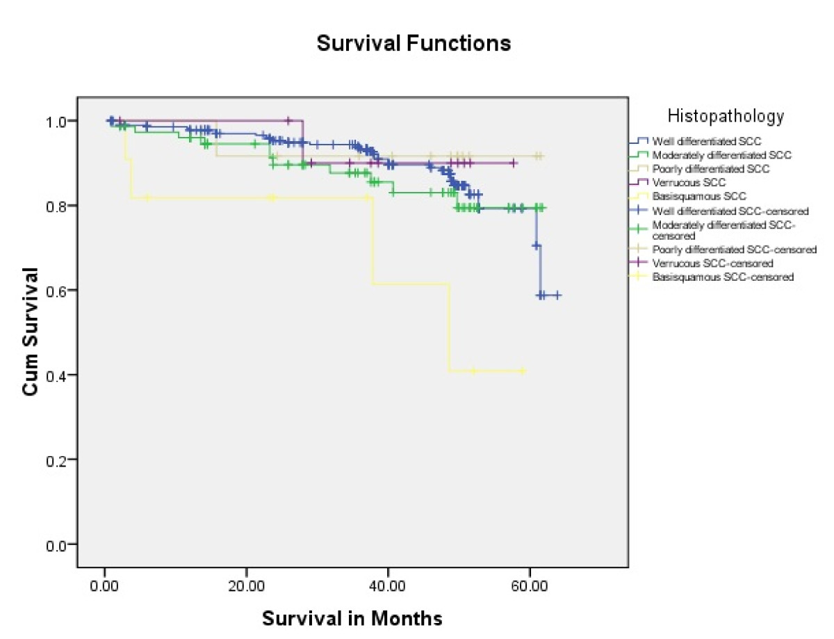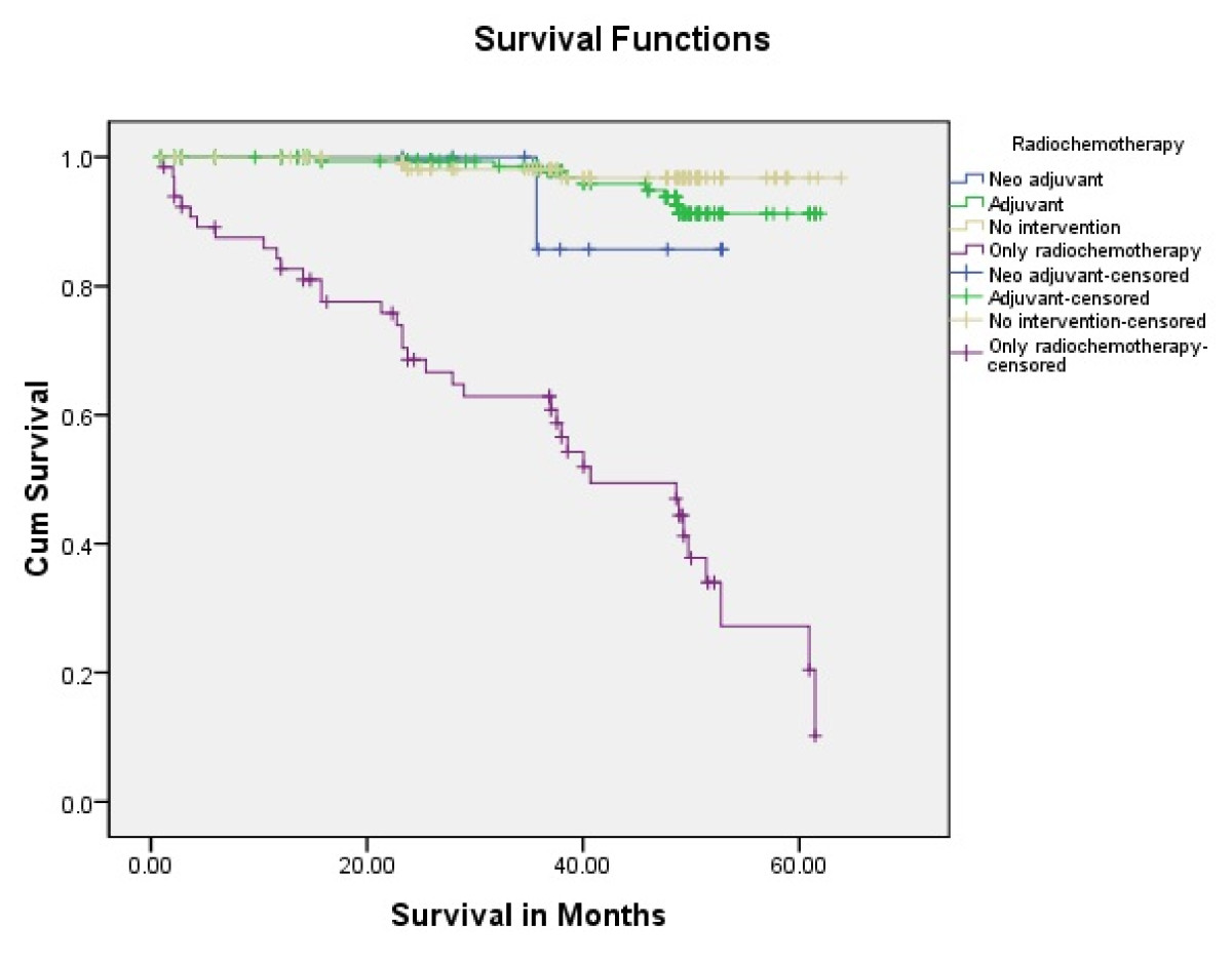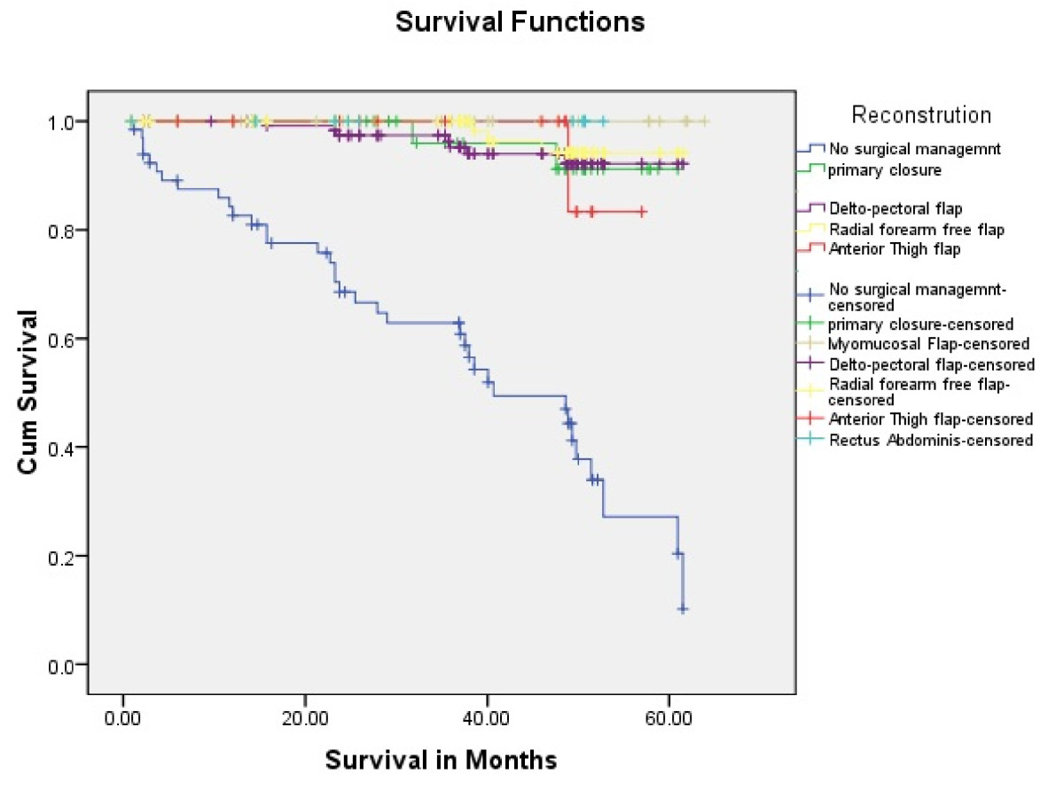 Tongue carcinoma patients treated by non surgical treatment modalities had 5 years survival rate of 45.5% and patients with surgical intervention had survival rate of 96.1%.(Log Rank .000) (Figure 1). T1 tumour size had 100% survival rate where as T2, T3, T4 Tumour size had survival rate of 80%,96.7%,77.4% respectively (Log Rank .000).(Figure 2). Survival in both sexes was nearly equal (87.5%, 87.9% Male female)(Log rank .833) (Figure 3). Patients with no previous history of any lesion had maximum survival rate of 94.4% where as recurrent lesion had worst prognosis with survival rate of 26.9% (Figure 4). Patients with bilateral neck dissection had best survival rate of 100% where as supra-omohyoid had survival rate of 95.8% where as patients with no surgical intervention of neck had worst prognosis of 45.5% (Figure 5). Frozen section technique for surgical margin evaluation had survival rate of 98.5% where as patients with no surgical intervention had survival rate of 45.5% (Figure 6). The Myomucosal and Rectus abdominal flap has survival rate of 100% where as Radial forearm free flap has survival rate of 97%.; Delto-pectoral flap has survival rate of 94.9%, primary closure 94.7%, and anterior thigh flap of 93.8% (Figure 7). The well differentiated squamous cell carcinoma had survival rate of 88.9%, moderate differentiated squamous cell carcinoma is 85.5%, poorly differentiated SCC and Verrucous SCC 91.7% each. The Basisquamous SCC survival rate of 63.6% (Figure 8). Survival rate of adjuvant radiochemotherapy was 95.5%, neoadjuvant 90.0% as compared to group of patients treated by radiochemotherapy of 45.5%(Figure 9)