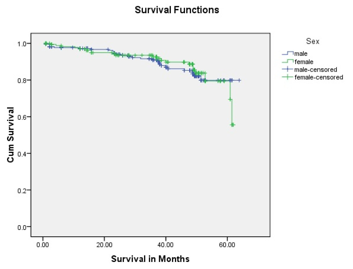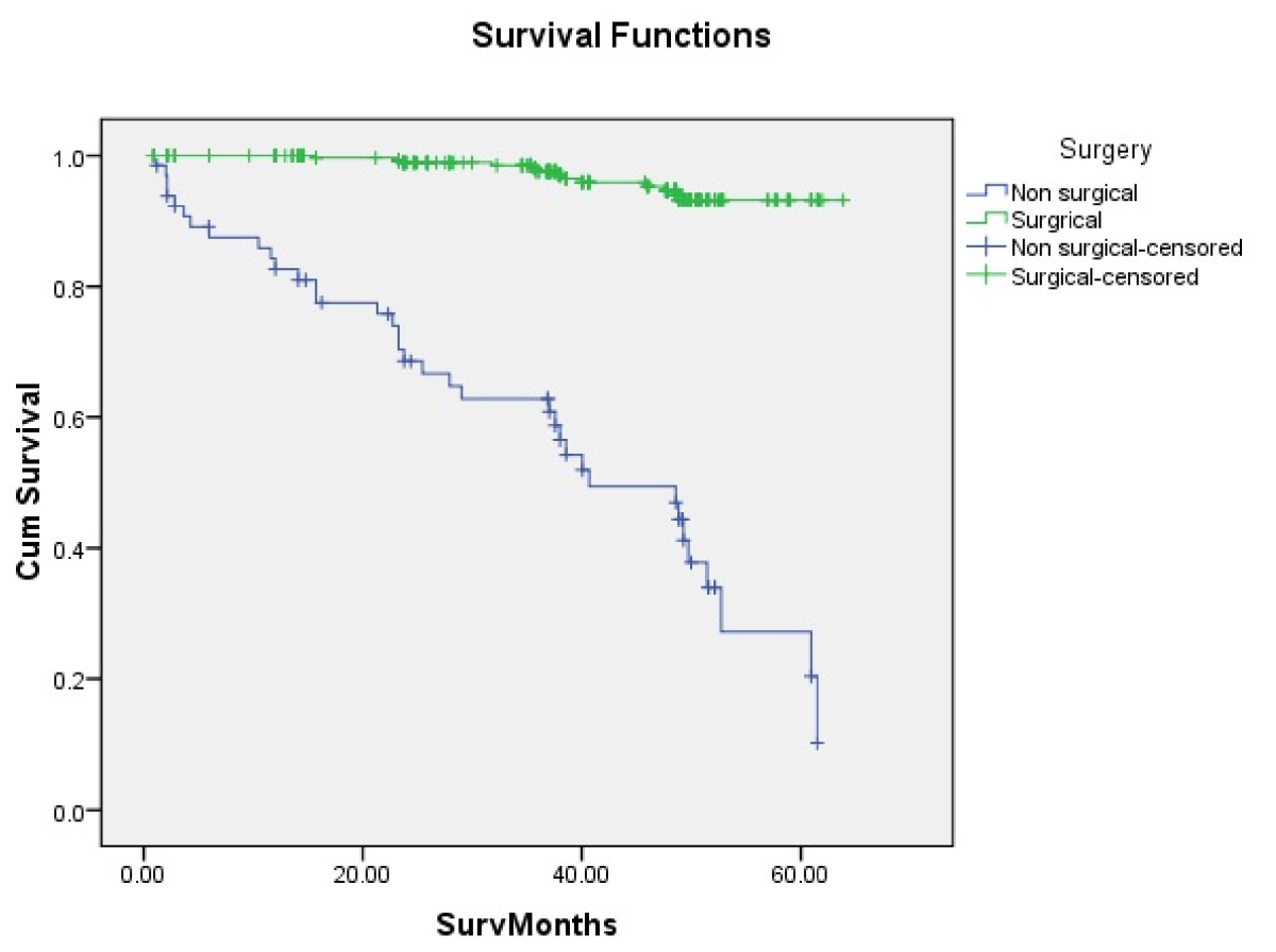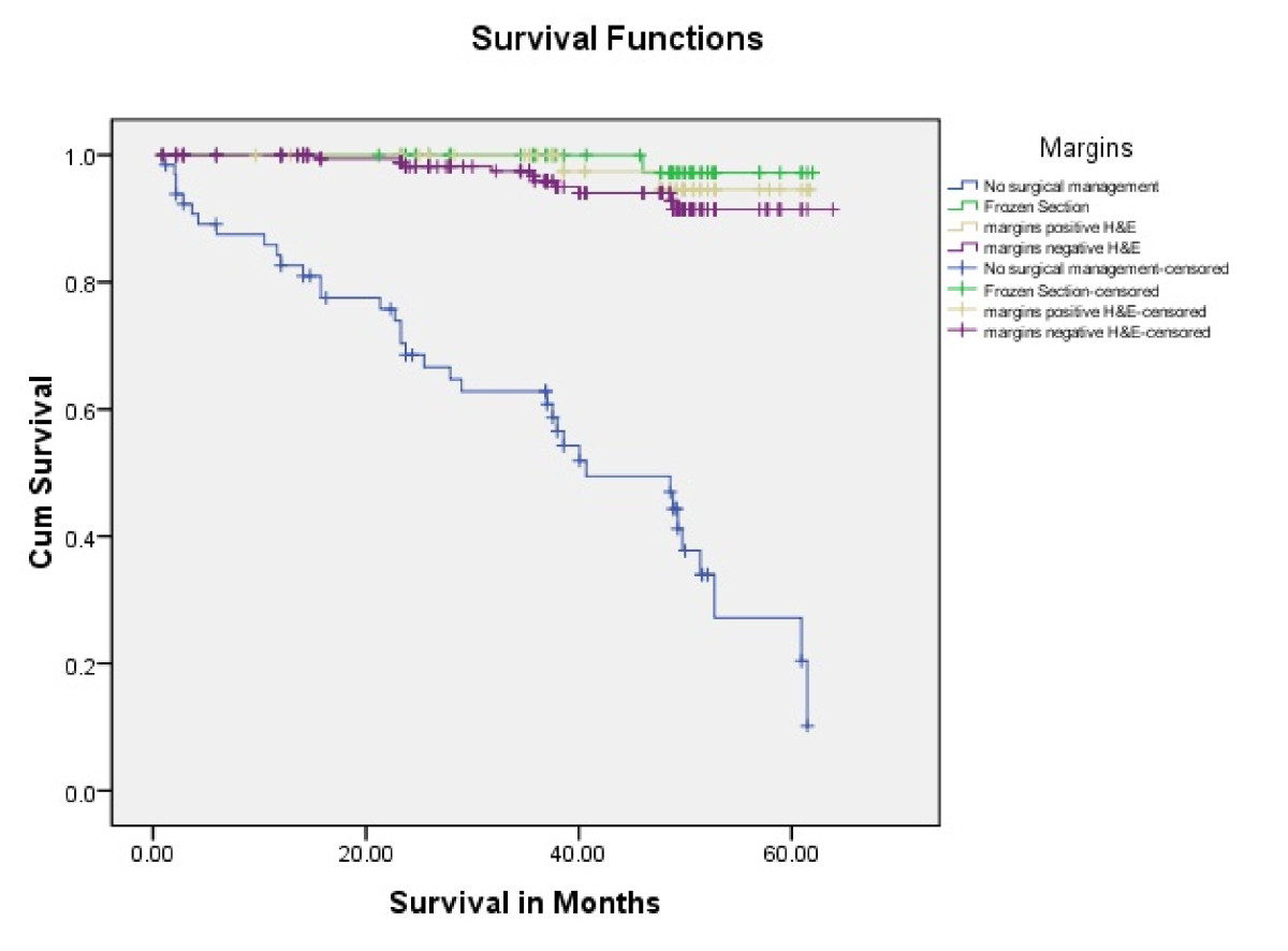 Tongue carcinoma patients treated by non surgical treatment modalities had 5 years survival rate of 45.5% and patients with surgical intervention had survival rate of 96.1%.(Log Rank .000) (Figure 1). T1 tumour size had 100% survival rate where as T2, T3, T4 Tumour size had survival rate of 80%,96.7%,77.4% respectively (Log Rank .000).(Figure 2). Survival in both sexes was nearly equal (87.5%, 87.9% Male female)(Log rank .833) (Figure 3). Patients with no previous history of any lesion had maximum survival rate of 94.4% where as recurrent lesion had worst prognosis with survival rate of 26.9% (Figure 4). Patients with bilateral neck dissection had best survival rate of 100% where as supra-omohyoid had survival rate of 95.8% where as patients with no surgical intervention of neck had worst prognosis of 45.5% (Figure 5). Frozen section technique for surgical margin evaluation had survival rate of 98.5% where as patients with no surgical intervention had survival rate of 45.5% (Figure 6). The Myomucosal and Rectus abdominal flap has survival rate of 100% where as Radial forearm free flap has survival rate of 97%.; Delto-pectoral flap has survival rate of 94.9%, primary closure 94.7%, and anterior thigh flap of 93.8% (Figure 7). The well differentiated squamous cell carcinoma had survival rate of 88.9%, moderate differentiated squamous cell carcinoma is 85.5%, poorly differentiated SCC and Verrucous SCC 91.7% each. The Basisquamous SCC survival rate of 63.6% (Figure 8). Survival rate of adjuvant radiochemotherapy was 95.5%, neoadjuvant 90.0% as compared to group of patients treated by radiochemotherapy of 45.5%(Figure 9)