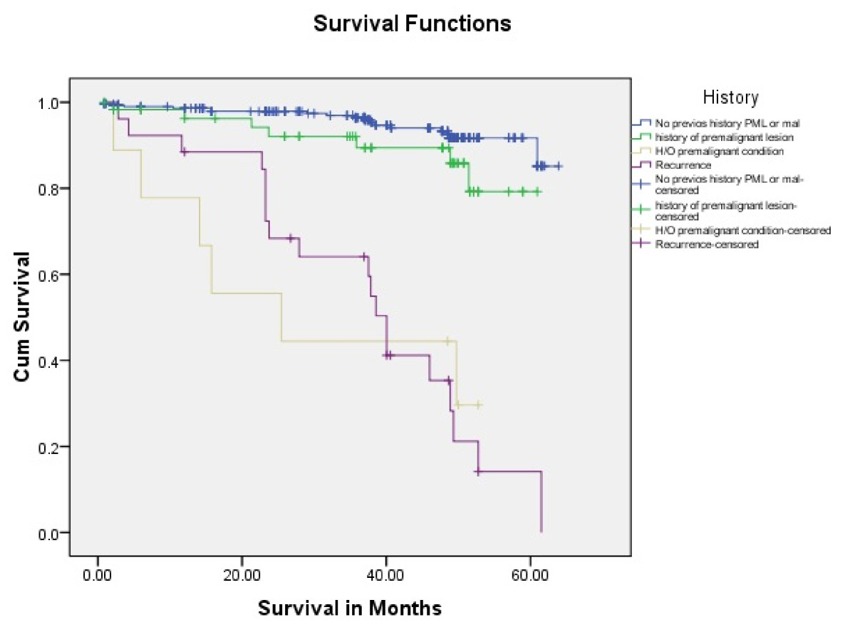 The prognostic pathogenesis of HNSCC including tongue carcinoma is better known today. The impact HPV, field cancerization and pathogenesis of oral premalignant lesion/conditions with malignant potential in tongue carcinoma patients are also affecting the treatment outcomes (20).In our study we have the same results; the patients with no previous history of premalignant lesion, condition and recurrence had better 5 years survival rate as compared to other groups (Figure 4 Log Rank .012).