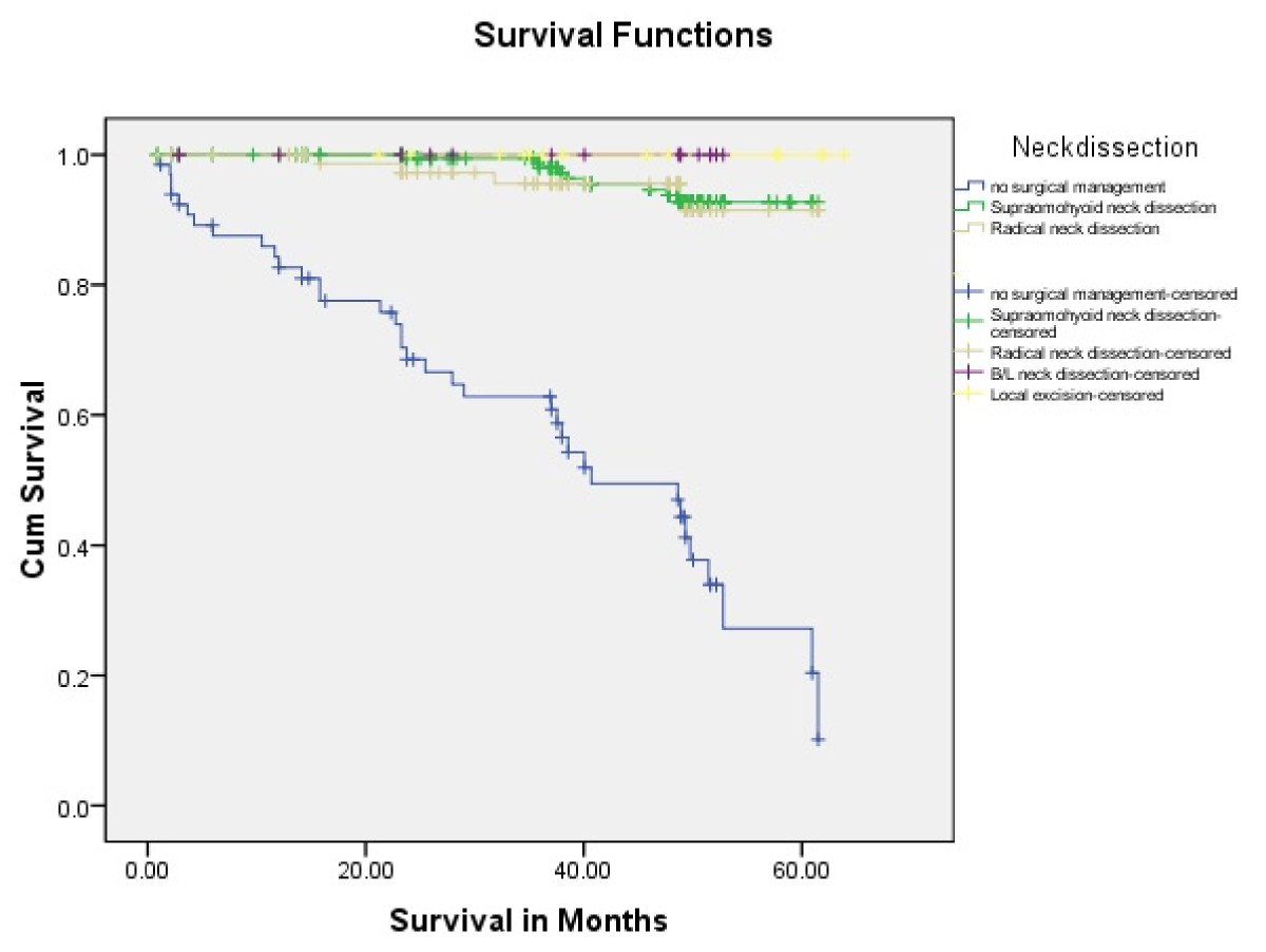 The management of neck is an important decision for the clinician. In our study up to 5 years survival is better in patients with neck management (Table 4). We have seen that almost 64% with supraomohyoid neck dissection had 5 year survival rate as it was most frequently performed. The N0 status in tongue carcinoma is also requisite for the selective neck dissection (21).