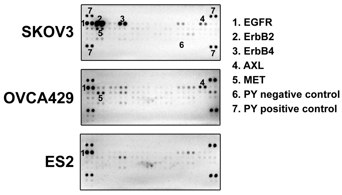 By phospho-RTK assays, the expression and activation of EGFR, ERBB2, ERBB4 and MET were activated in SKOV3 cells, and EGFR, MET and AXL in OVCA429 cells, and EGFR in ES2 cells under serum starved medium condition (Figure 1).