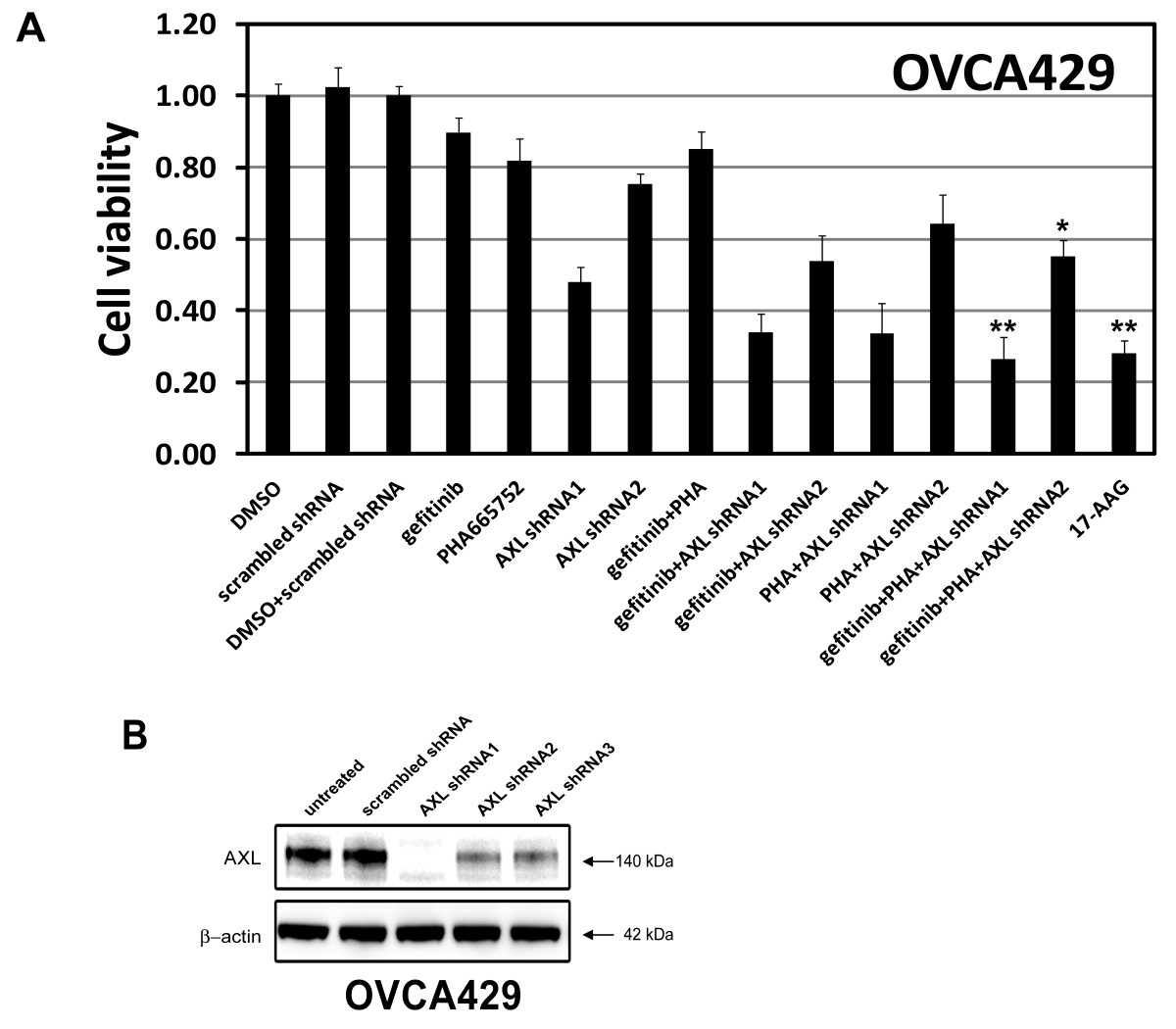 A) Cell viability, in ovarian cancer cell line OVCA429, was evaluated by the CellTiter-Glo luminescence assay after 72 h treatment with EGFR (1 μM gefitinib), MET (1 μM PHA665752), or AXL (AXL shRNA1 and AXL shRNA2) inhibitor alone and together, and HSP90 inhibitors (1 μM 17-AAG). The data were normalized to the DMSO control, and represent the mean values (± s.d.) of quadruplicate cultures (*p < 0.05, **P < 0.01, n = 3). B) Imunoblotting evaluations of AXL expression in OVCA429 cells post-infection AXL shRNA at 72 h.