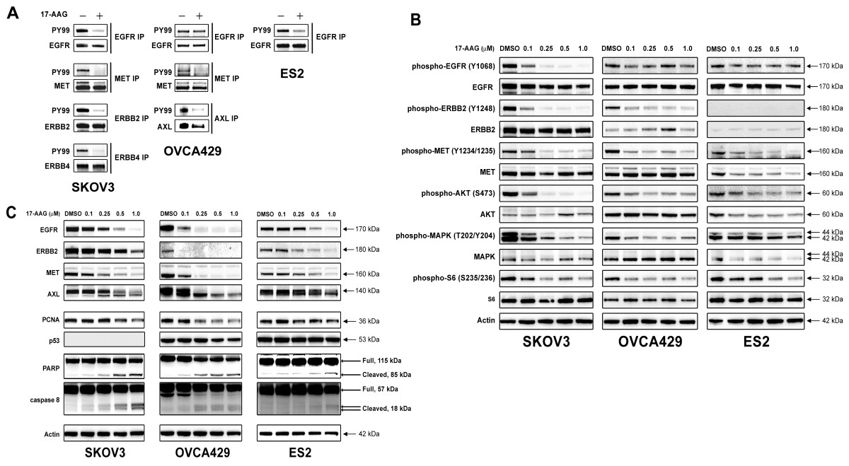 A) Inhibition of EGFR, ERBB2, ERBB4, AXL and MET phosphorylation in cell immunoprecipitates after 4 h 17-AAG (1 μM) treatment in serum-free medium. B) Immunoblotting evaluated effects of HSP90 inhibitor 17-AAG on RTK EGFR, ERBB2, and MET, and intermediate AKT, S6 and MAPK activation, after 4 h treatment in serum-free medium. C) Effects of HSP90 inhibitor 17-AAG on EGFR, ERBB2, MET, AXL, PCNA, p53, Caspase 8 and PARP expression in ovarian cancer lines, after 48 h 17-AAG treatment in serum-containing medium. β-actin stain is a loading control.