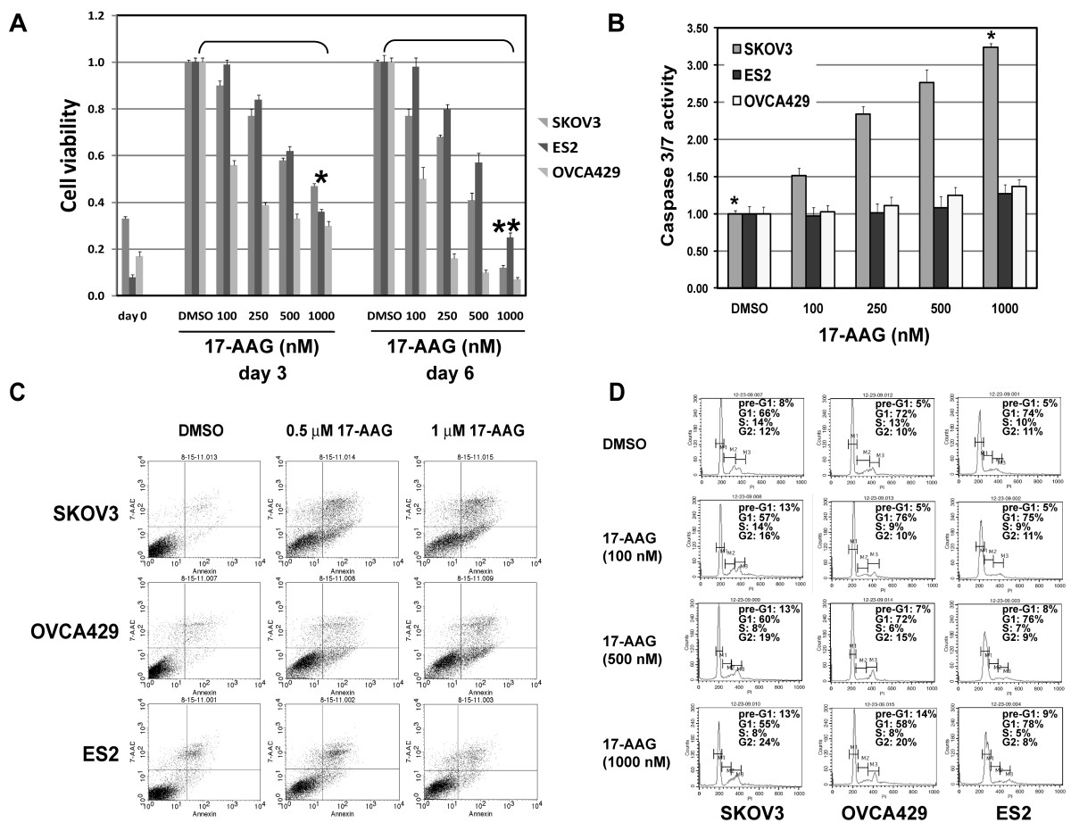 The 24 or 48 hour 17-AAG treatments induced apoptosis, as evidenced by an increase of caspase3/7 activity (Figure 5B), the expression of caspase 8, and PARP cleavage (Figure 4C). Ovarian cancer lines analyzed at 48 h post 17-AAG treatment had dramatic increase in apoptotic cells compared to matched vehicle-treated cells (Figure 5C and Additional File 1 Table S1). The apoptosis was most prominent in SKOV3, the same cell line showing the highest level of nuclear fragmentation after 17-AAG treatment (Figure 5D).
