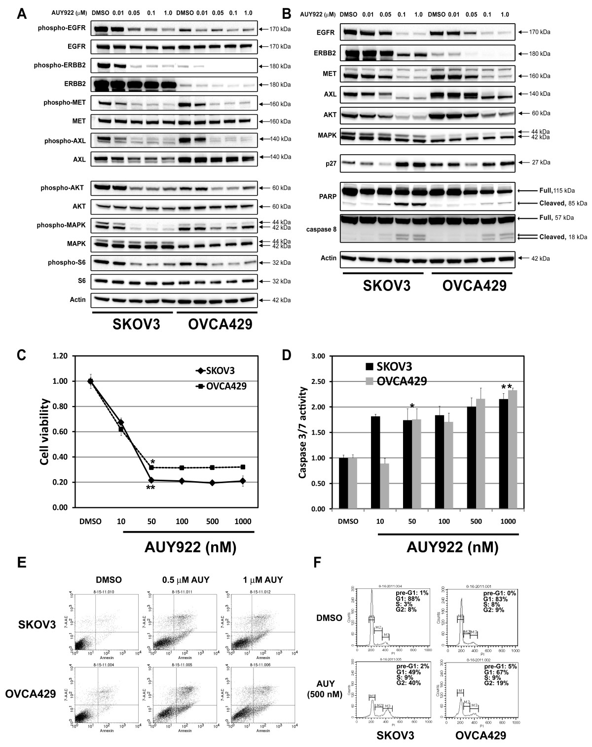 SKOV3 and OVCA429 were incubated with AUY922 for 48 h and subjected to western blot analyses. The phosphorylation of EGFR, ERBB2, MET, AXL, AKT, MAPK and S6 were all inhibited (Figure 6A); the total EGFR, ERBB2, MET, AXL and AKT expression were also inhibited (Figure 6B). These alterations were associated with upregulation of p27 (Figure 6B), consistent with cell cycle arrest induced by AUY922. Substantial reduce in cell viability was detected in both ovarian cancer cell lines by AUY922 (Figure 6C), and apoptosis was evidenced by caspase 8, and PARP cleavage, a significant increase in caspase 3/7 activity (Figure 6B and 6D), and a dramatic increase in apoptotic cells compared with matched vehicle-treated cells (Figure 6E and Additional File 1, Table S1). Cell cycle analyses demonstrated a G2 block in SKOV3 and OVCA429 treated with AUY922 (Figure 6F).