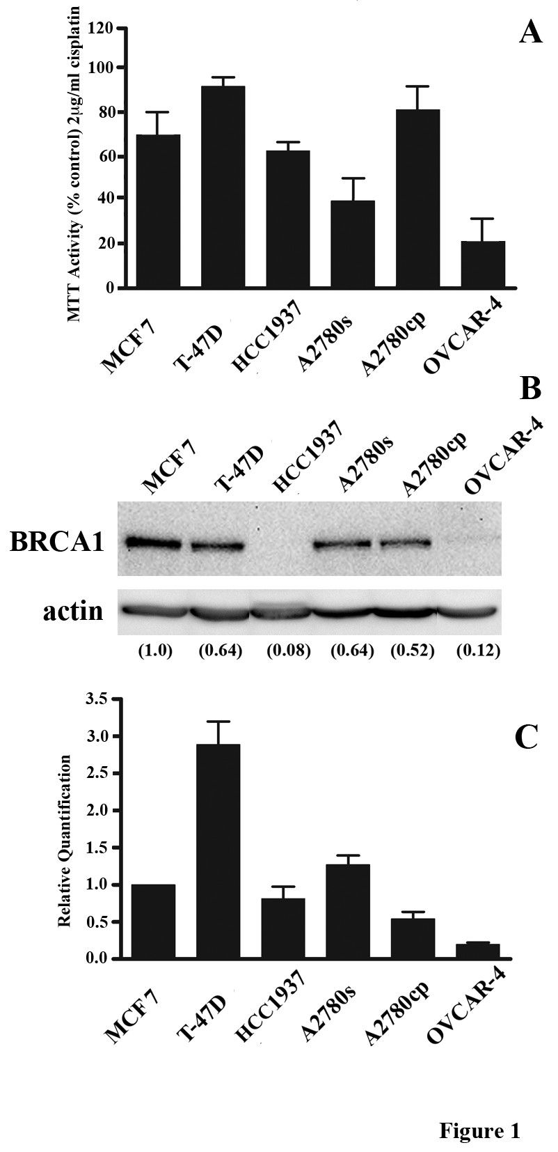 Three breast cancer cell lines (MCF7, T-47D, and HCC1937) and three OC cell lines (A2780s, A2780cp, and OVCAR-4) were chosen for analysis due to their varying degree of sensitivity to cisplatin treatment (Figure 1A). Consistent with other reports, T-47D and A2780cp demonstrated cisplatin resistance, whereas MCF7, HCC1937, A2780s, and OVCAR-4 displayed a range of sensitivity to cisplatin treatment (23)(24). The basal level of BRCA1 protein expression was analyzed by Western blot (Figure 1B). MCF7 displayed the most significant level of BRCA1 protein expression of the breast cancer cell lines and was assigned a value of 1.0. As expected, HCC1937 cells, which harbor the germ line BRCA1 frame shift mutation 5382insC, leading to a premature stop codon and a truncated non-functional protein (25), did not display detectable BRCA1 protein. A2780s cells expressed the highest level of BRCA1 protein of the OC cell lines, but only slightly more than their cisplatin-resistant counterpart, A2780cp. All cell lines were evaluated by RT-PCR for BRCA1 mRNA expression with varying levels shown (Figure 1C). HCC1937 cells demonstrated detectable levels of BRCA1 mRNA, albeit lower than the other breast cancer cell lines examined, which is in keeping with the previous observation that tumors from germ line mutation carriers express mRNA levels lower than in sporadic tumors (26). Overall, variable levels of BRCA1 mRNA and protein were detected in the ovarian and breast cancer cell lines analyzed which is consistent with the range of expression levels previously observed in ovarian and breast tumor specimens (4)(7)(27).