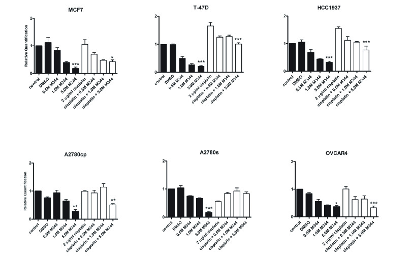 BRCA1 mRNA levels were analyzed by RT-PCR following 24 hrs of treatment with 0.5, 1.0, or 5.0 μM M344 either alone or in combination with 2 μg/ml cisplatin. DMSO is the solvent control for the M344 treatment and 2 μg/ml cisplatin is the control for the combination. Values represent the mean +/- SEM of three separate experiments. Statistically significant differences, when present, between 5 μM M344 and DMSO control or 2 μg/ml cisplatin + 5 μM M344 and 2 μg/ml cisplatin alone are indicated by * where P < 0.05, ** where P < 0.01, and *** where P < 0.001.