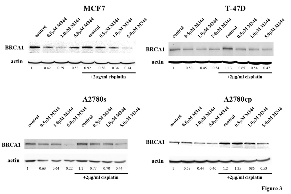With the addition of M344, the platinum-sensitive breast and ovarian cancer cell lines that displayed relatively high BRCA1 protein levels demonstrated significant potentiation of cisplatin cytotoxicity in association with a reduction of BRCA1 protein. The cisplatin-resistant cell lines, T-47D and A2780s, elicited increased cytotoxicity of cisplatin with M344 and down regulation of BRCA1 protein levels. A2780s cells subjected to combination platinum and M344 treatment, demonstrated increased DNA damage as assessed by the presence of phosphorylated H2A.X foci in comparison to either treatment alone. Using Chromatin Immunoprecipitation, A2780s and MCF7 cells exposed to M344 alone and in combination with cisplatin, did not demonstrate enhanced acetylated Histone 4 at the BRCA1 promoter, suggesting an indirect effect on this promoter.