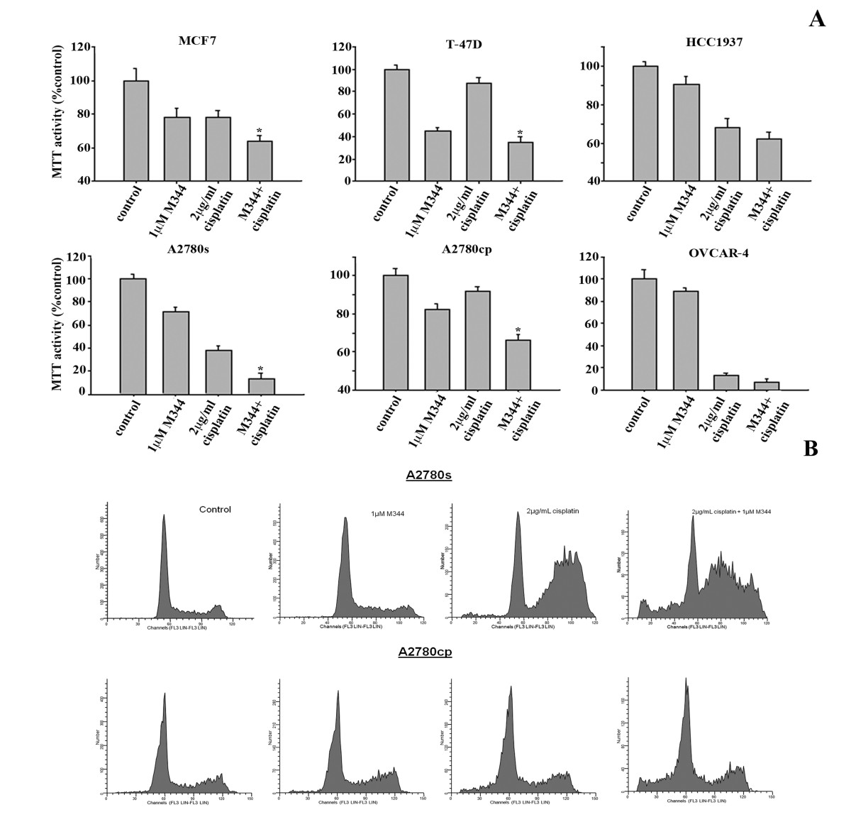 A) MTT cell viability assays comparing the responses of a panel of cell lines to 1 μM M344 alone, 2 μg/ml cisplatin alone or both treatments in combination for 48 hrs. Cell viability was assayed with the activity of untreated cells taken to be 100%. Values represent the mean +/- SEM of three separate experiments. Differences between treatment with cisplatin alone versus treatment with the cisplatin and M344 combination were analyzed using paired T-test analyses. * indicates a significant difference where P < 0.001. B) Percentage of apoptotic cells in the A2780s cell line following 24 hrs of treatment and A2780cp cell line following 48 hrs treatment with 1.0 μM M344 alone or in combination with 2 μg/ml cisplatin as assessed by flow cytometry. The experiment was done in three replicates with similar results.