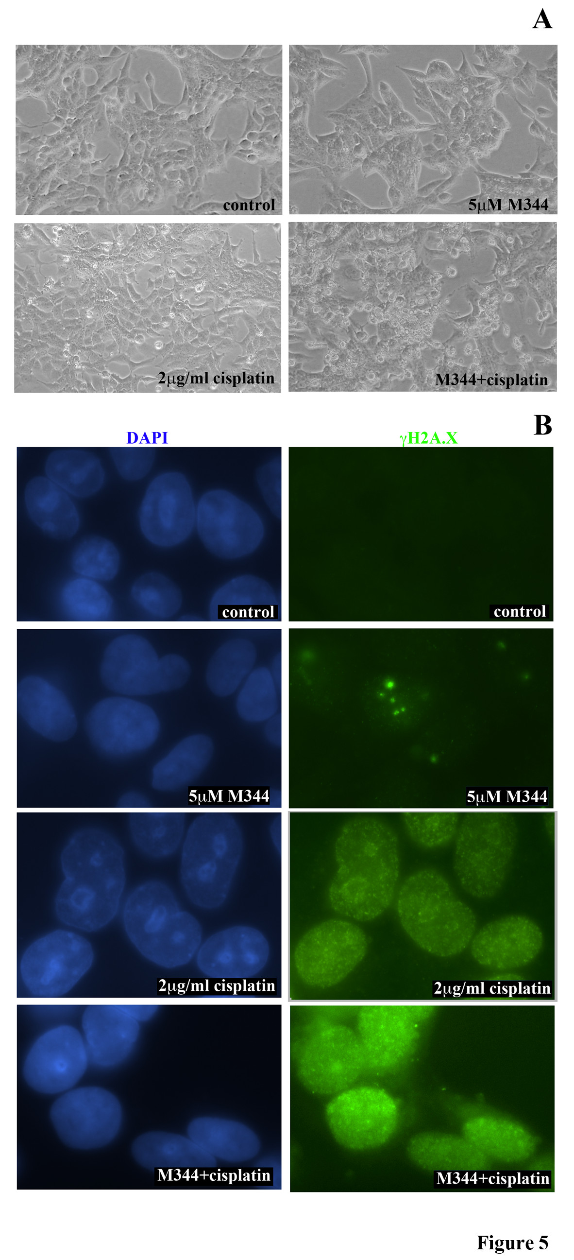X foci. A) Phase contrast images of A2780s cells following 24 hrs of treatment with 5.0 μM M344 alone or in combination with 2 μg/ml cisplatin. B) A2780s cells subjected to combination platinum and M344 24 hr treatment demonstrates increased levels γH2A.X foci detected by immunoflourescence. Repeat of the experiment showed similar findings.
