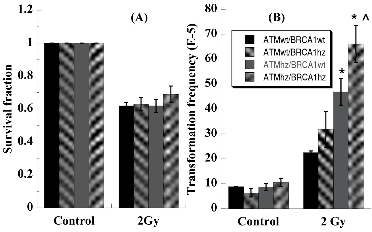 After cells were exposed to 2 Gy of photons, permissive soft-agar assay was performed immediately to assess cell survival (Panel A) and 1 week later, non-permissive soft-agar assay were performed to assess neoplastic transformation (Panel B). Transformants were visually scored under a dissecting microscope. Data are from four independent experiments. * indicates the significant difference (p < 0.05) compared with ATMwt/BRCA1wt cells and ^ indicates the significant difference (p < 0.05) compared with ATMwt/BRCA1hz cells experienced the same treatment.