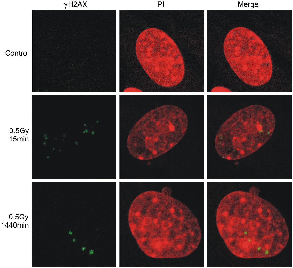 Cells were exposed to 0.5 Gy of photons and stained with mouse anti-γH2AX antibody visualized by Alexa Fluor® 488 anti-mouse antibody and propidium iodide (PI) at 15 and 1440 min post-irradiation.