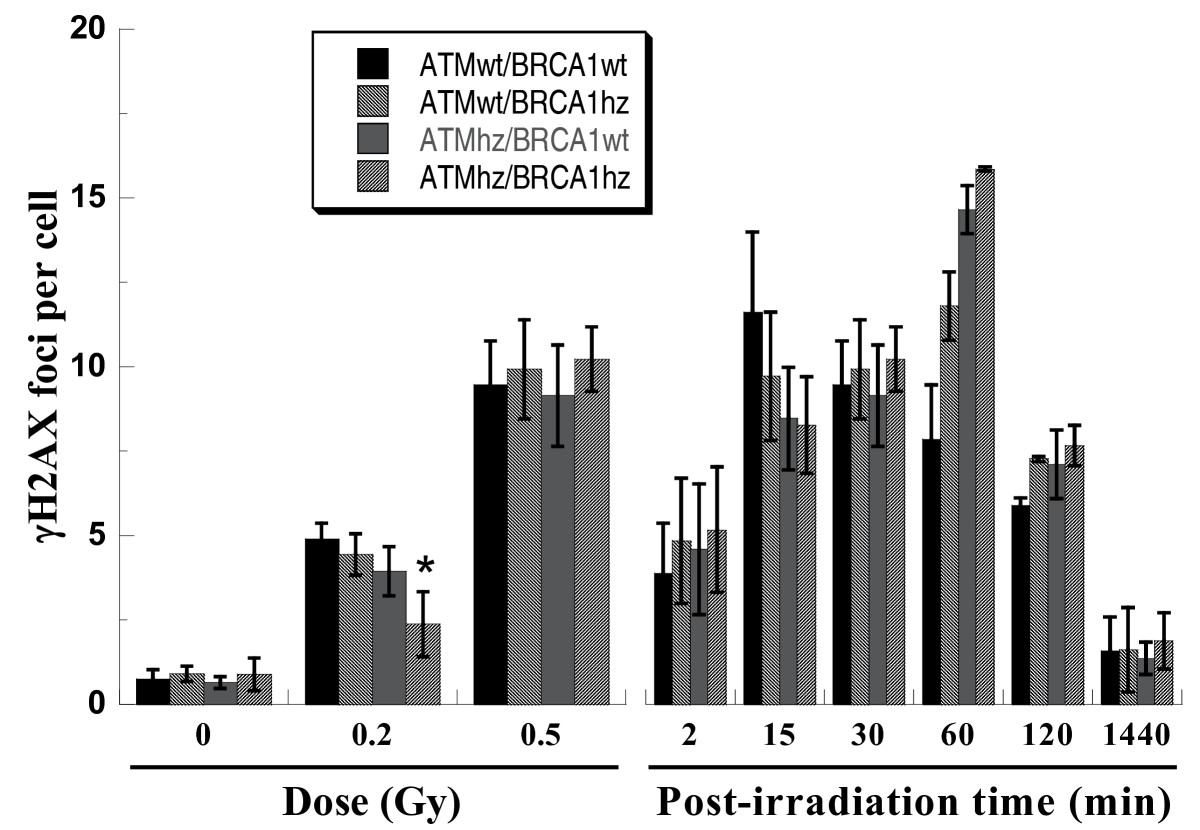 Dose response (left) and kinetics (right) of γH2AX focus formation. Samples for dose response were fixed at 30 min after irradiation and kinetics was for 0.5Gy of photons. * indicates the significant difference (p < 0.05) compared with ATMwt/BRCA1wt cells exposed to 0.2 Gy of photons.