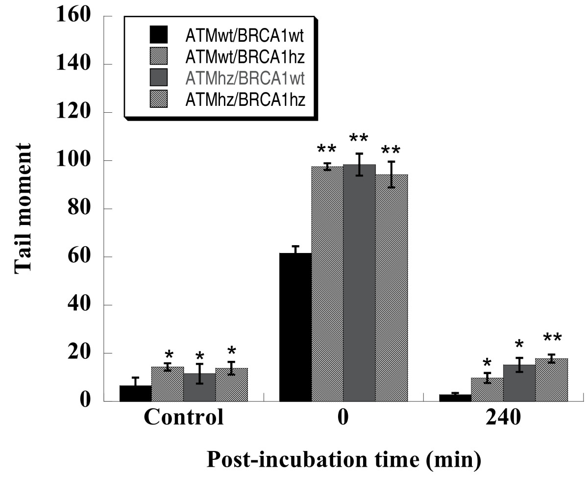 Data were a pool of three independent experiments and totally 200 cells were scored. * and ** indicate the significant difference compared with ATMwt/BRCA1wt cells experienced the same treatment and same post-incubation (* for p < 0.05 and ** p < 0.01).
