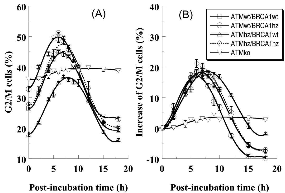 As expected, 5 Gy of photons induced G2/M block in all genotypes. Notably the induction of G2/M block was similar in all the genotypes (Figure 5). However, different genotypes followed different dynamics of G2/M-phase cell release. Wild type cells overcame the G2/M arrest in 13 hours. Brca1 single heterozygous cells overcame that block earlier while Atm single heterozygous cells later. Interestingly, single heterozygosity results in disturbed cell cycle control while double heterozygous cells showed a similar cell cycle dynamics to the wild type cells.