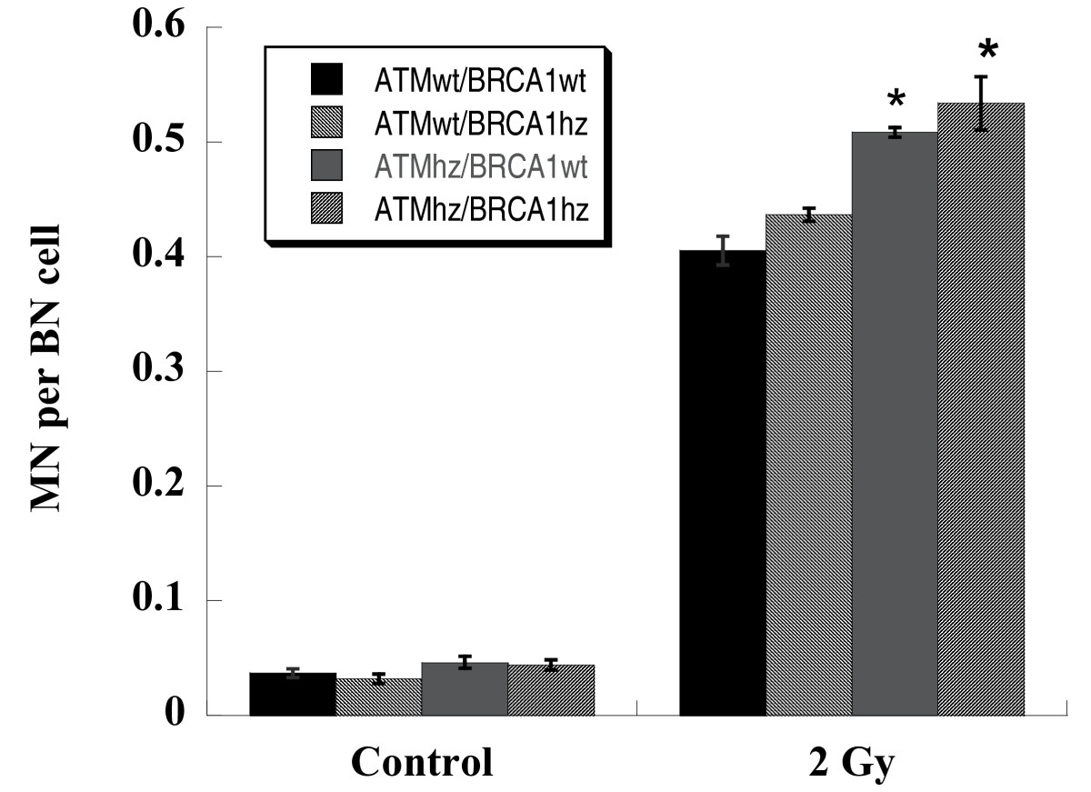 Individual cells were visualized with Acridine Orange staining and micronuclei (MN) per binucleated cell (BN) were score under fluorescence microscope. More than 500 BN cells were counted for each sample. Data were pooled from three independent experiments. * indicates the significant difference (p < 0.05) compared with ATMwt/BRCA1wt cells exposed to the same dose of photons.