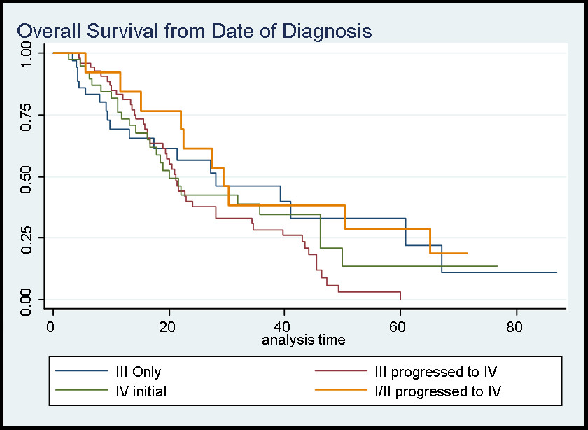 The blue line represents Stage III (whom did not progress to Stage IV, maroon line represents Stage III which progressed to Stage IV, green line represents the initial stage IV patients and lastly the gold line represents the Stage I/II patients that progressed to Stage IV.