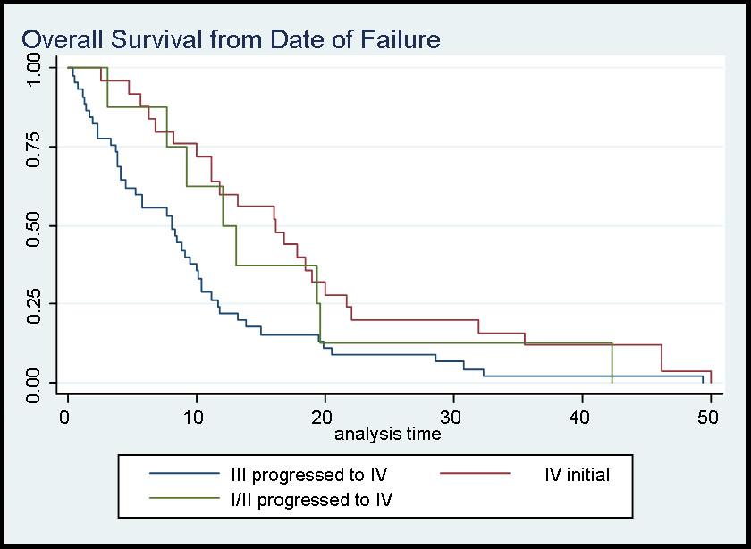 The blue line represents Stage III which progressed to Stage IV, green line represents the Stage I/II patients that progressed to Stage IV, and lastly the maroon line represents initial stage IV patients.