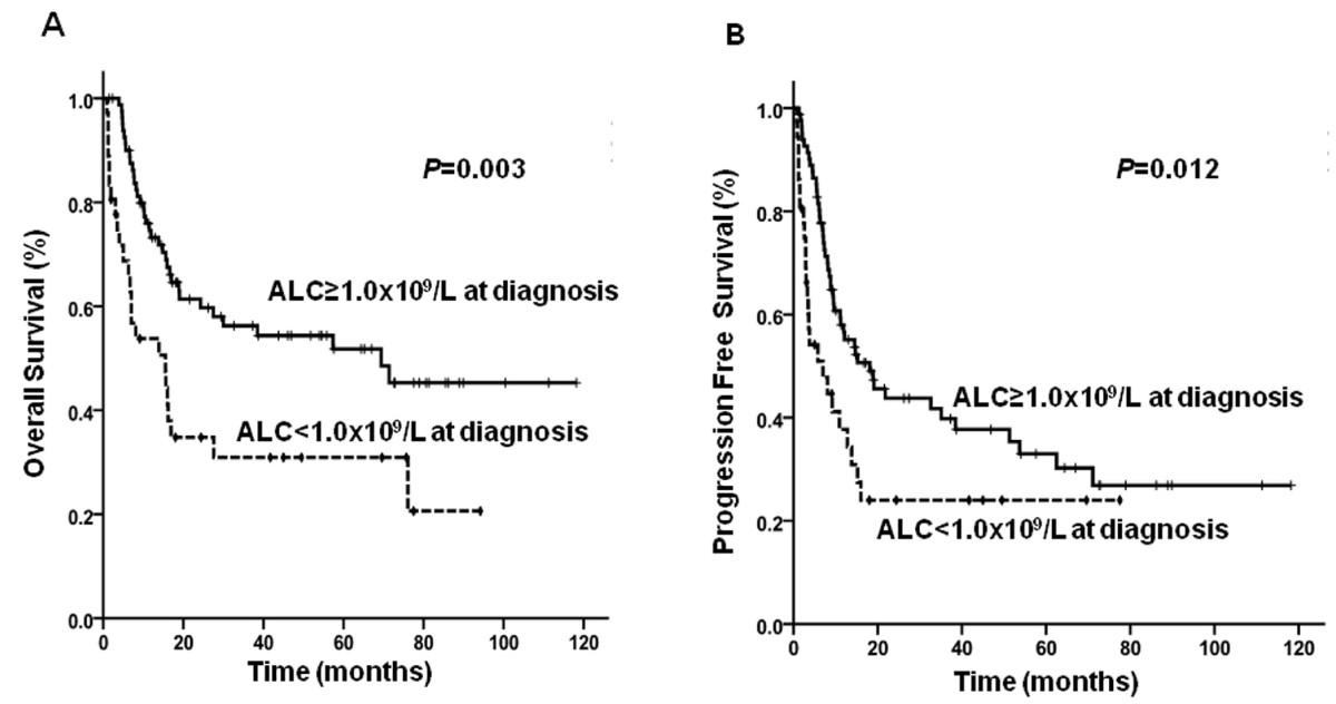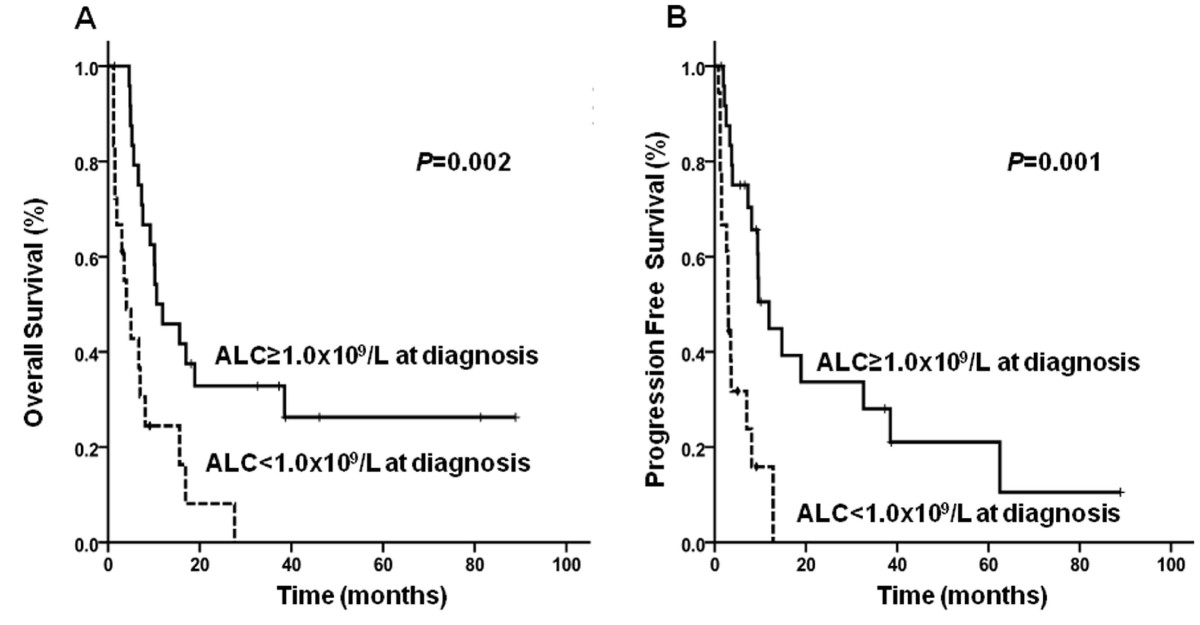Thirty-six patients (30.5%) had a low absolute lymphocyte count (ALC, < 1.0 × 109/L) at diagnosis. Patients with lymphopenia had shorter overall survival (OS) and progression-free survival (PFS) rates compared with patients with high ALCs (P = 0.003, P = 0.012, respectively). In multivariate analysis, high-intermediate/high-risk International Prognostic Index (IPI) scores and lymphopenia were both associated with shorter OS and PFS. Treatment-related mortality was 25.0% in the low ALC group and 4.8% in the high ALC group (P = 0.003). In patients considered high-intermediate/high-risk based on IPI scores, lymphopenia was also associated with shorter OS and PFS (P = 0.002, P = 0.001, respectively).