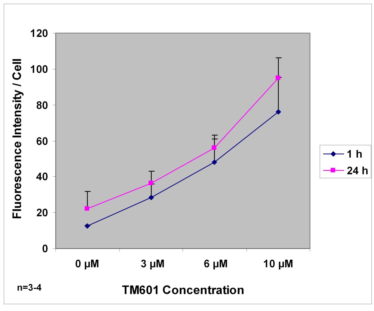 TM601 dose response of U373 glioma incubated with 0, 3, 6, and 10 μM TM601 for 1 h or 24 h and evaluated by immunocytochemistry and confocal microscopy in n = 3-4 experiments. The fluorescence intensity/cell was obtained studying 50-100 cells/each concentration of TM601 (at 1 h and 24 h) in each experiment. Presented are means and SD for each TM601 concentration.