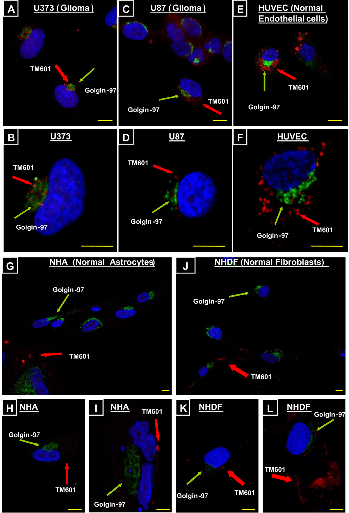 The confocal evaluation of human glioma cells (U373 and U87) treated for 24 h with 10 μM TM601, detected TM601 near trans-Golgi (Figure 2A, B, C, D). Golgin-97, a 97 kDa member of the granin protein family is a peripheral membrane protein localized on the cytoplasmic face of the Golgi apparatus and it is unique to the Golgi apparatus of most vertebrate species. Therefore, Golgin-97 was used as a marker for the identification of the Golgi apparatus in the glioma and normal cells. Similar to glioma cells, normal human umbilical vascular endothelial (HUVEC) cells showed TM601 localization near the trans-Golgi membranes (Figure 2E, F). However, following the same treatment of normal human dermal fibroblasts (NHDF) or normal human astrocytes (NHA) using 10 μM TM601 for 24 h, TM601 appeared as diffused staining in the cytoplasm, distant from the trans-Golgi area (Figure 2G, H, I, J, K, L). Therefore, TM601 cellular localization in these two normal cell types, NHA and NHDF, differed profoundly from what was observed in glioma cells and normal HUVEC cells. The negative non-TM601 treated cell controls showed no staining.