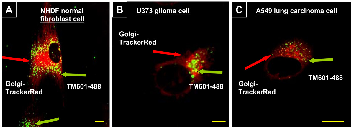 Images of live cells and cellular localization of TM601-488 (green) in relation to the Golgi-complex-Texas-Red (red) detected by direct fluorescence in NHDF normal human fibroblasts (A), U373 glioma (B), and A549 lung carcinoma (C). The figure shows similar perinuclear localization in the Golgi area of TM601-488 in glioma U373 and lung carcinoma A549, but in NHDF cells, TM601-488 is seen in the cytoplasm away from the Golgi area and outside the cell membrane. The data are representative of n = 9 experiments. Scale bars = 10 μm, magnification 1260 × (A), 630 × (B), 2000 × (C).
