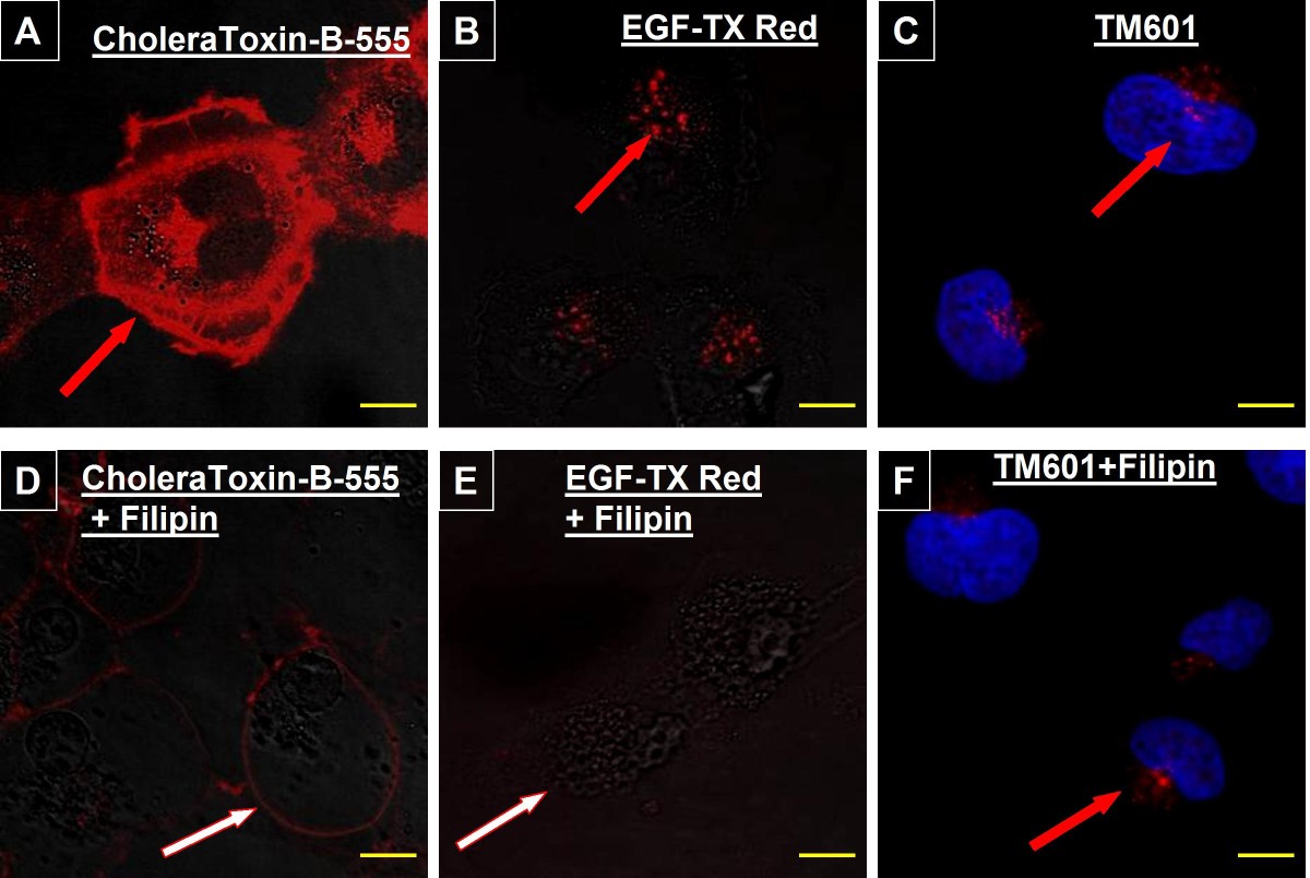 In addition, the effect of filipin on endocytosis of the epidermal growth factor (EGF)- biotynylated complex to Texas-Red streptavidin (TX-Red) at 1 or 10 μg/ml or CholeraToxin subunit B-555 at 1 μg/ml (both from Invitrogen, Carlsbad, CA) were evaluated. EGF was selected with a similar molecular weight (~6000 kDa) as TM601 (~4000 kDa). In these experiments cells were grown in MatTek's glass bottom dishes pre-treated with filipin at 1 or 5 μg/ml for 15 min at 4°C, followed by treatment with either EGF-TX-Red or cholera toxin-555 (in presence or absence of filipin) for 10 min at 4°C, removal of the reagents, washes and incubation of cells in growth medium containing 1% FBS for 15 min at 37°C in 5% CO2. The confocal evaluation of the cells' direct fluorescence was initially performed after first 10 min incubation at 4°C with the reagents (cell surface detection) and after final 15 min at 37°C incubation of cells (intracellular detection).